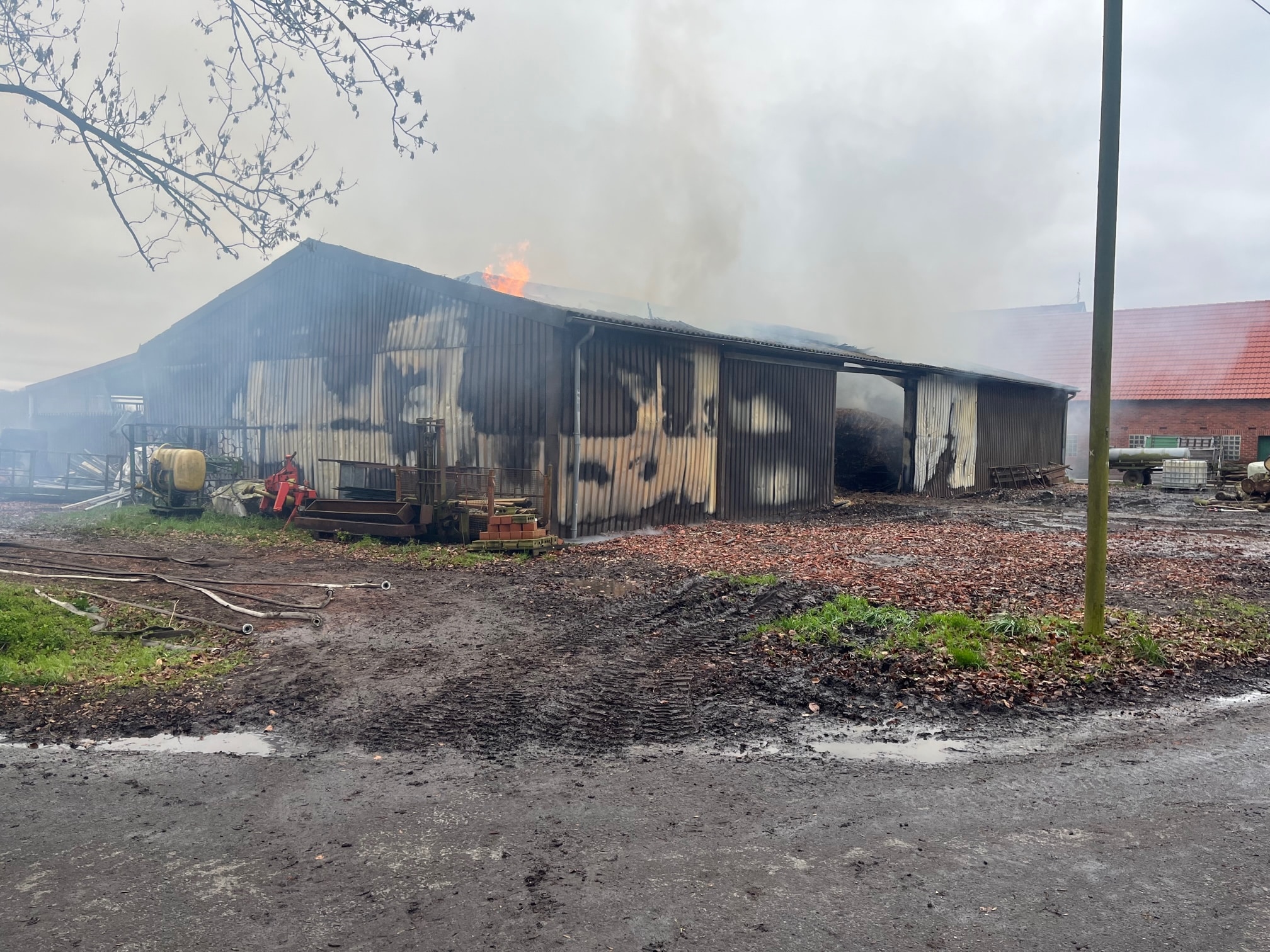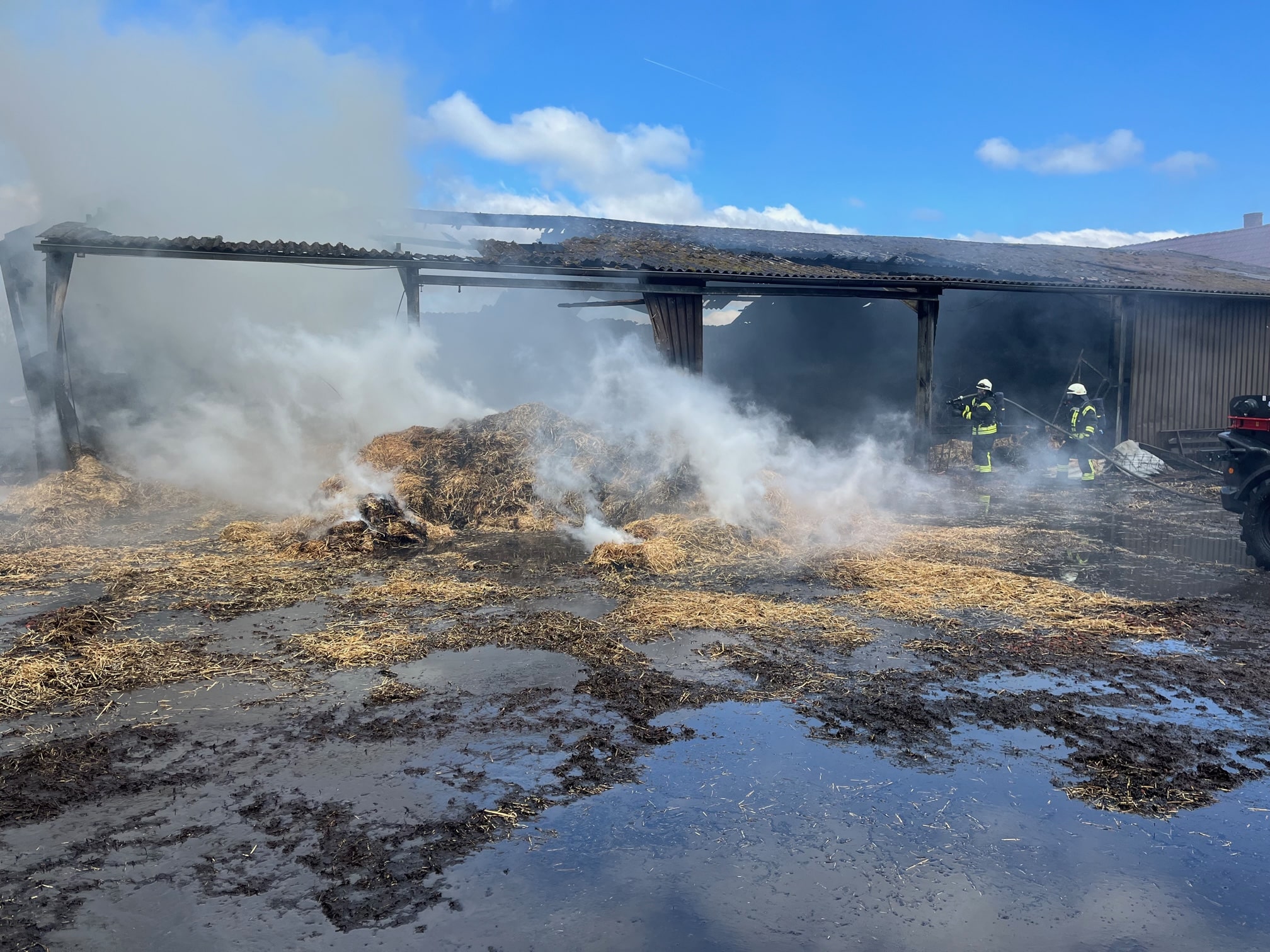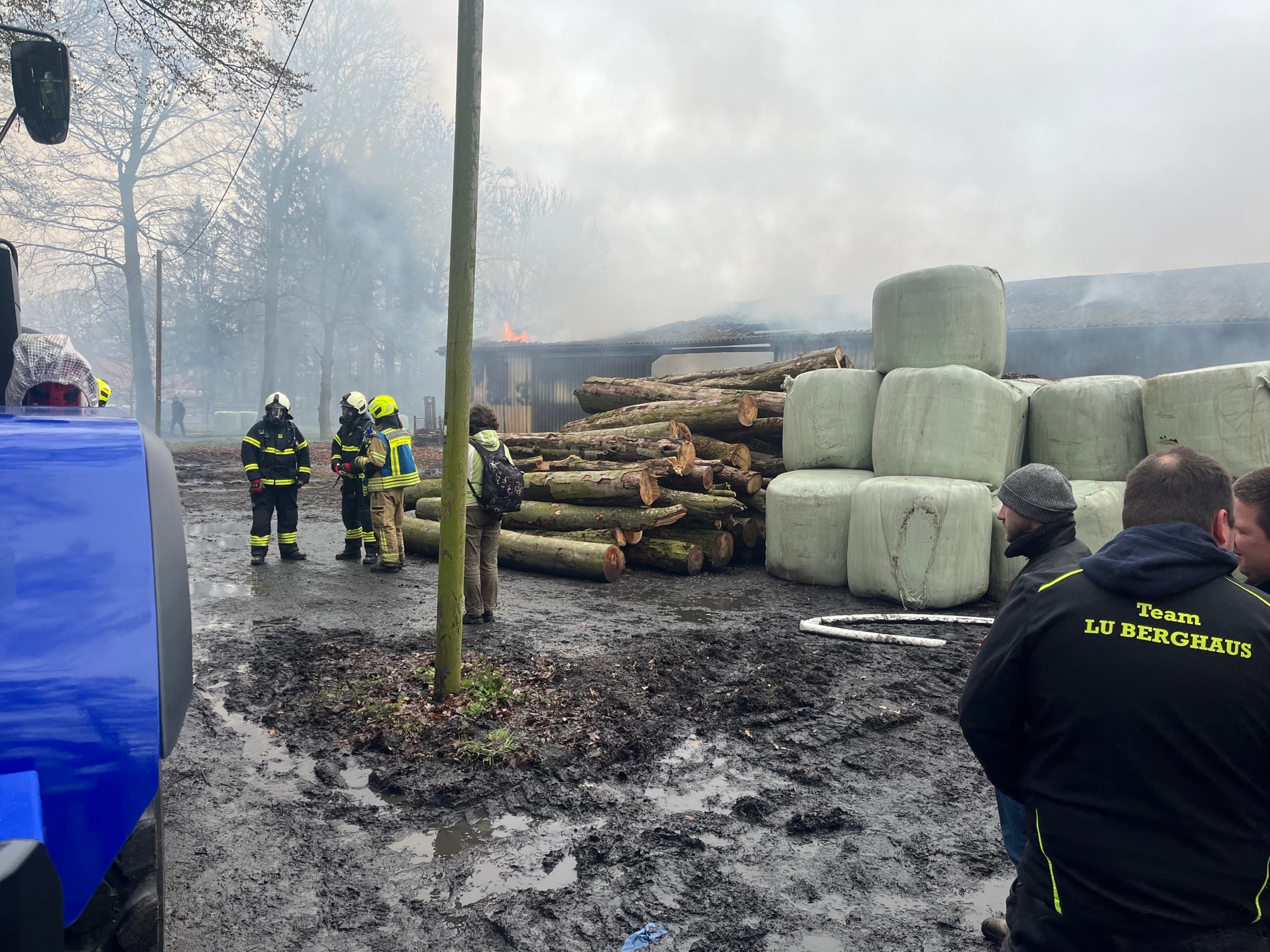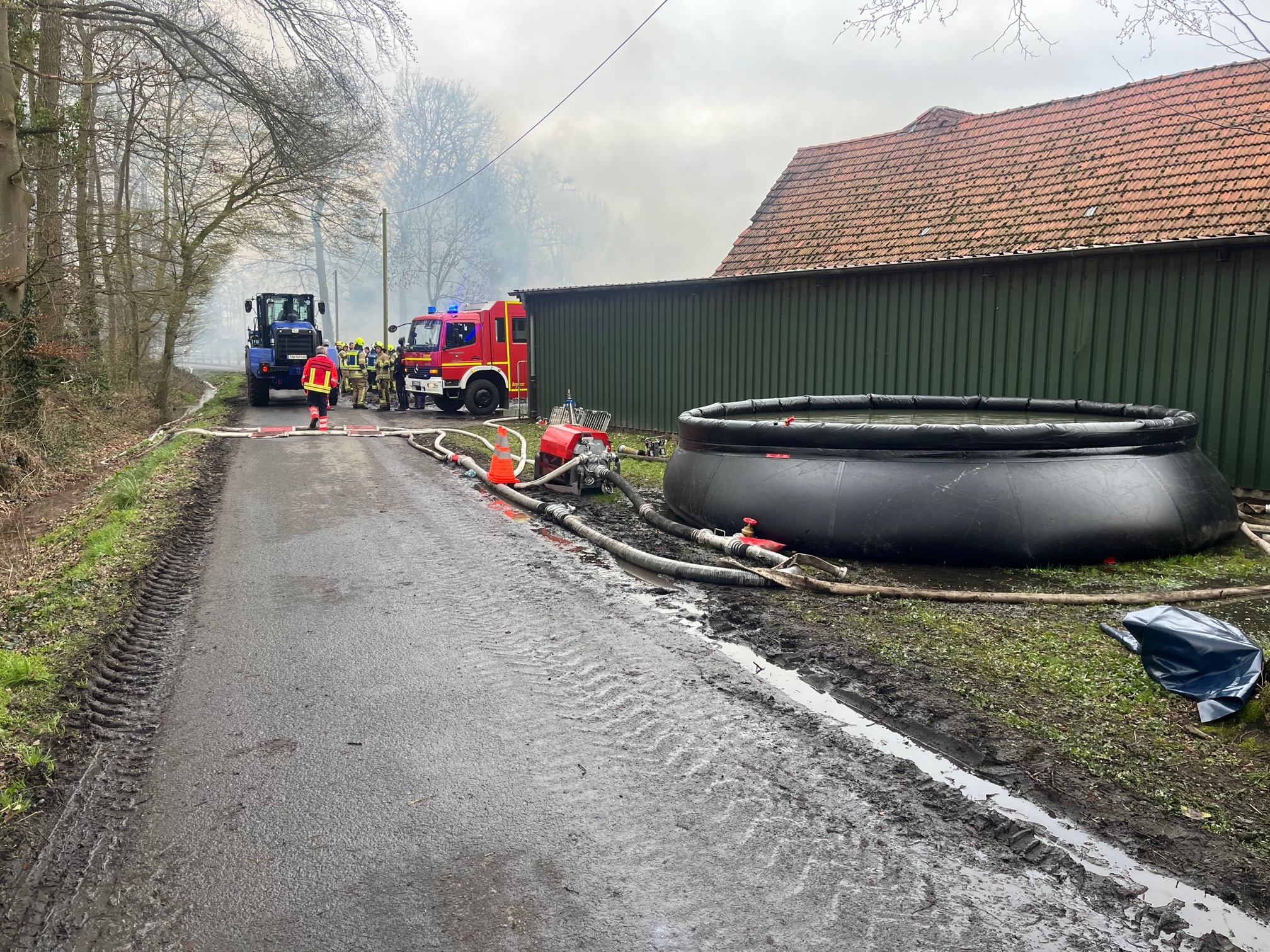 Nach Feststellung, dass eine Halle mit Stroh in voller Ausdehnung brannte, wurden die umliegenden Feuerwehren als Unterstützung angefordert.