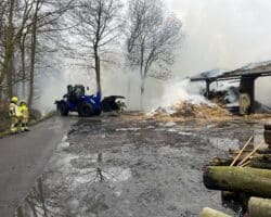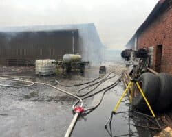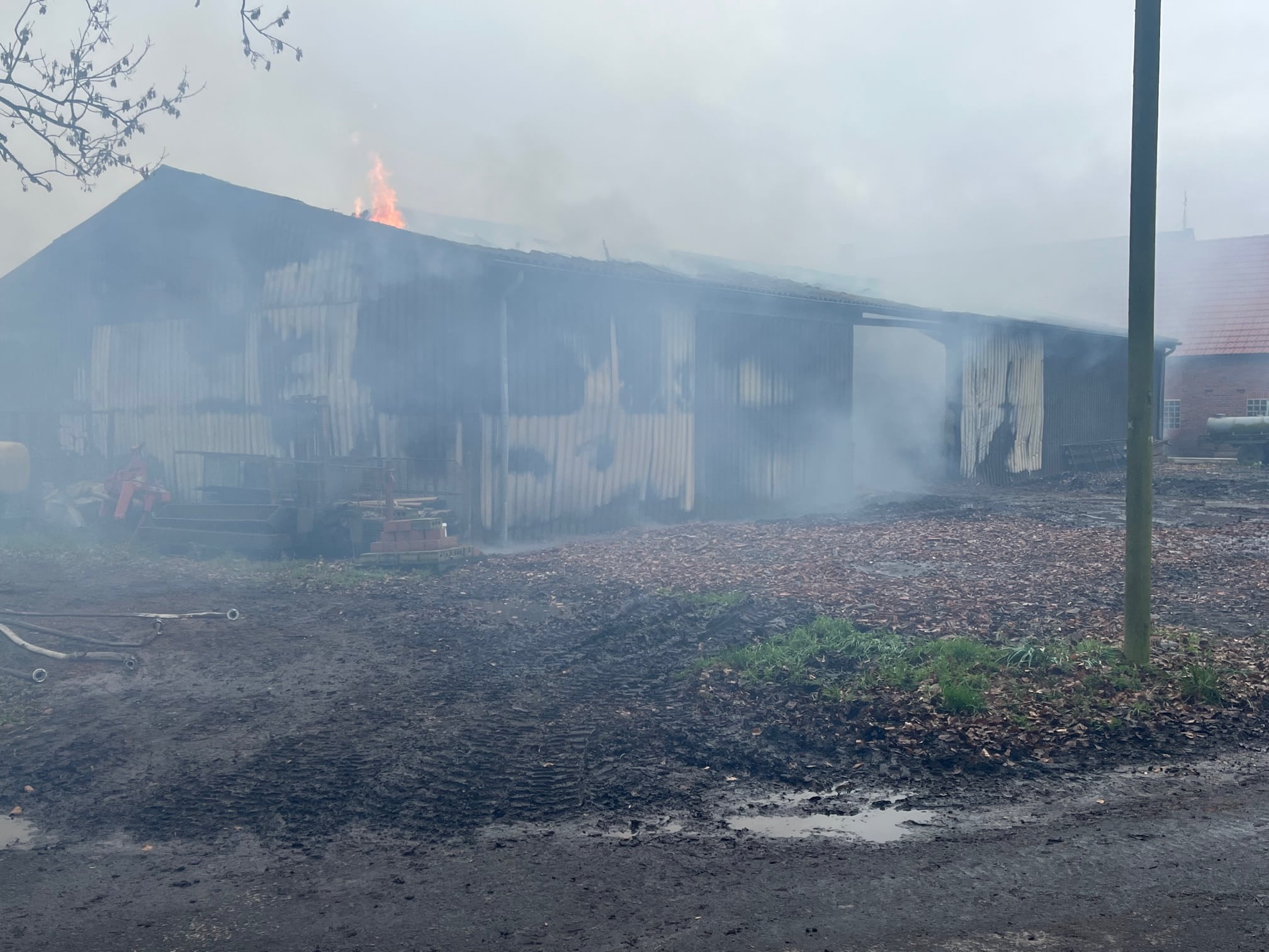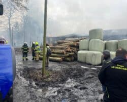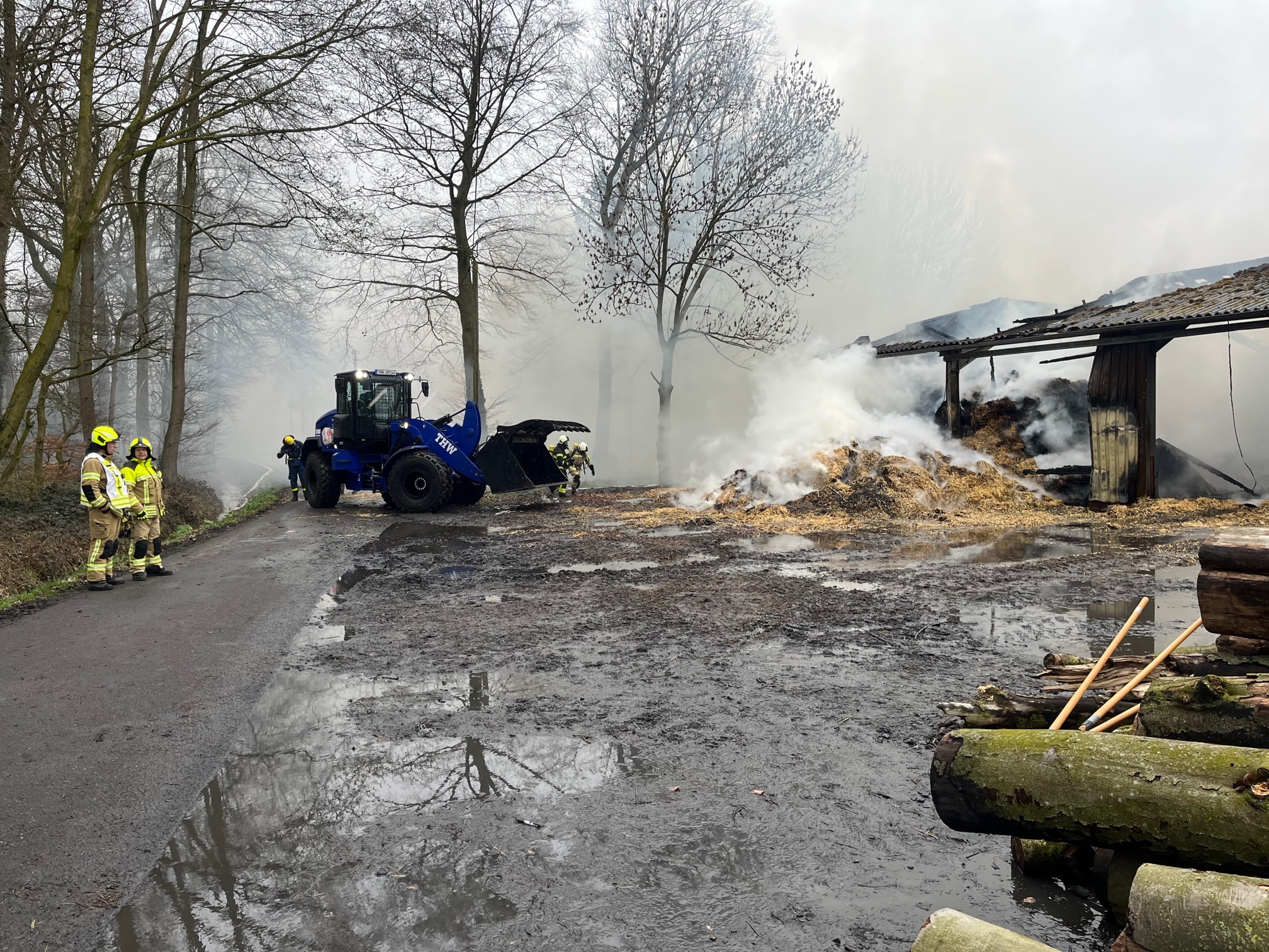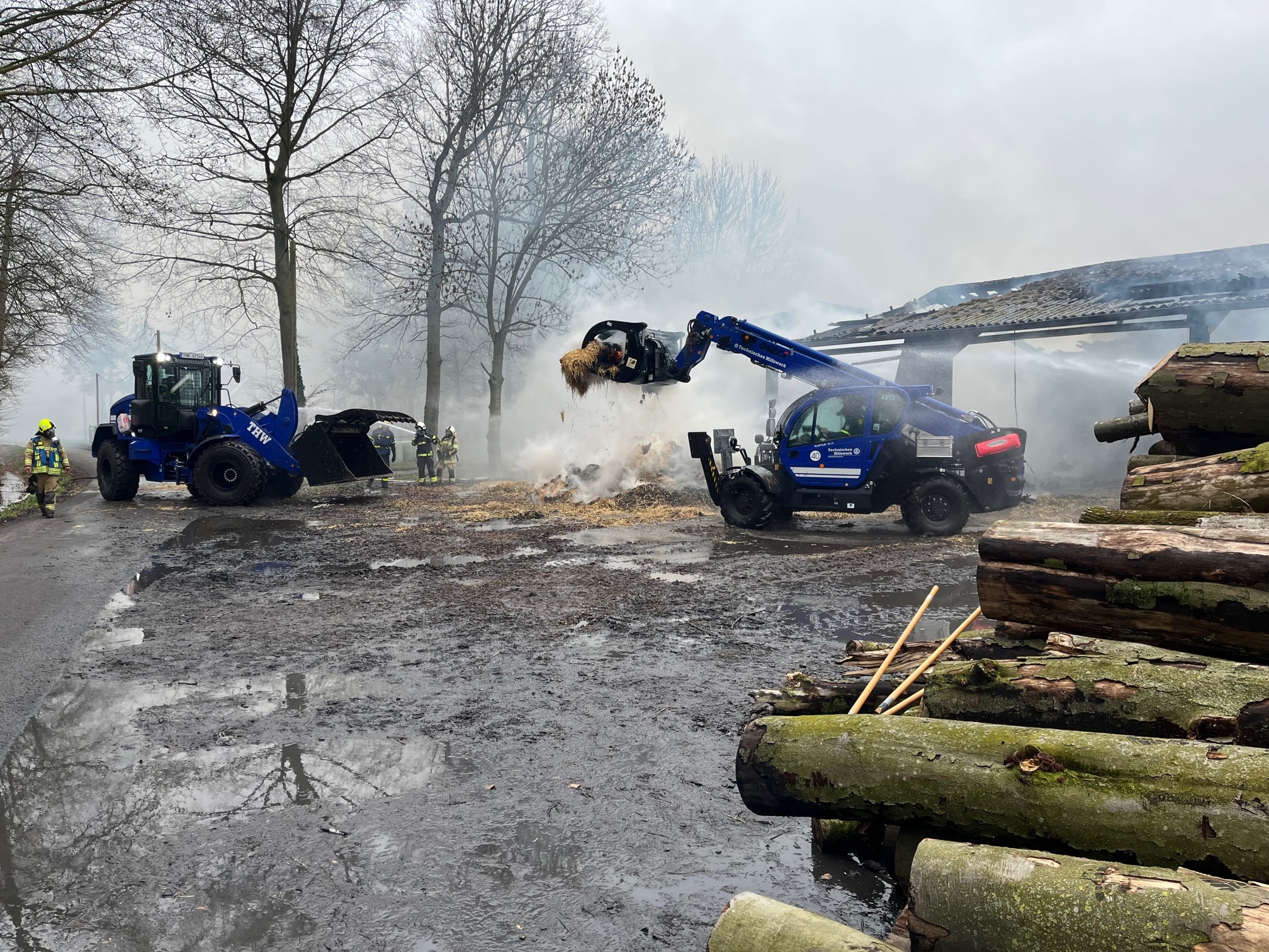 Nach Feststellung, dass eine Halle mit Stroh in voller Ausdehnung brannte, wurden die umliegenden Feuerwehren als Unterstützung angefordert.