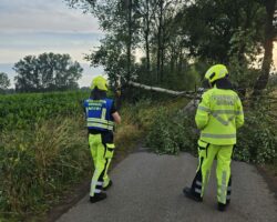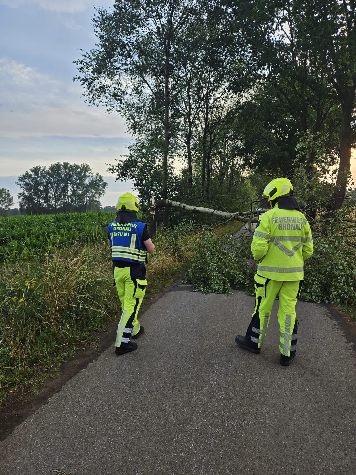 Im Laufe des Abends musste die Drehleiter der Feuerwehr Gronau noch zu einem Einsatz nach Legden auf die Kreisstraße K28 ausrücken. Hier versperrte ein Baum den Weg.
