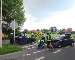 Die Feuerwehr Gronau wurde am 23.07.17 gegen 17:58 h zu einem Verkehrsunfall auf dem Heerweg Ecke An der Eßseite gerufen. Dort waren zwei PKW verunglückt, wobei einer auf dem Dach lag. Alle Insassen beider Fahrzeuge waren vor Eintreffen der Feuerwehr aus den Fahrzeugen ausgestiegen.