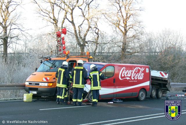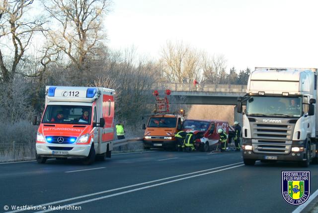 Gegen 09:00 Uhr ereignete sich auf der B 54 in Fahrtrichtung Münster ein Verkehrsunfall. Zwischen den Anschlussstellen Gronau-Ost und A 31 war ein Kleintransporter in ein Fahrzeug der Straßenmeisterei gefahren. Bei Einsätzen auf der B54 rückt von der Feuer-und Rettungswache ein Löschfahrzeug( HLF 20/16) zu Eigenabsicherung der Rettungsdienstkräfte mit aus. Bei diesem Verkehrsunfall mussten nicht nur die eigenen Kräfte abgesichert werden,sondern es wurden noch auslaufende Betriebsstoffe der verunfallten Autos aufgenommen. Eine verletzte Person wurde vom Rettungswagen ins Krankenhaus transportiert.