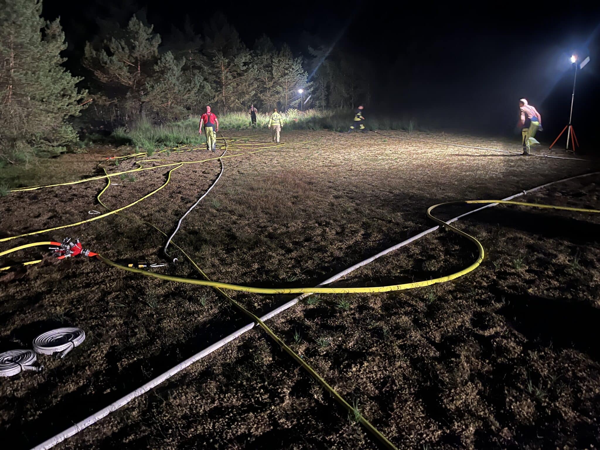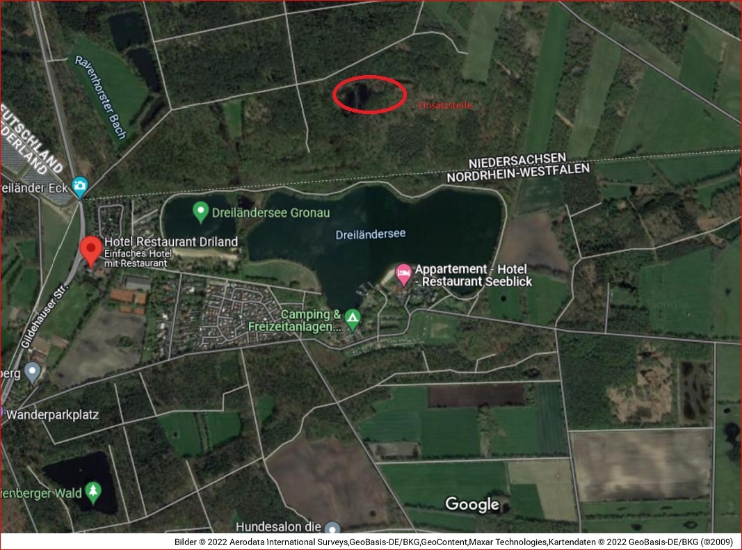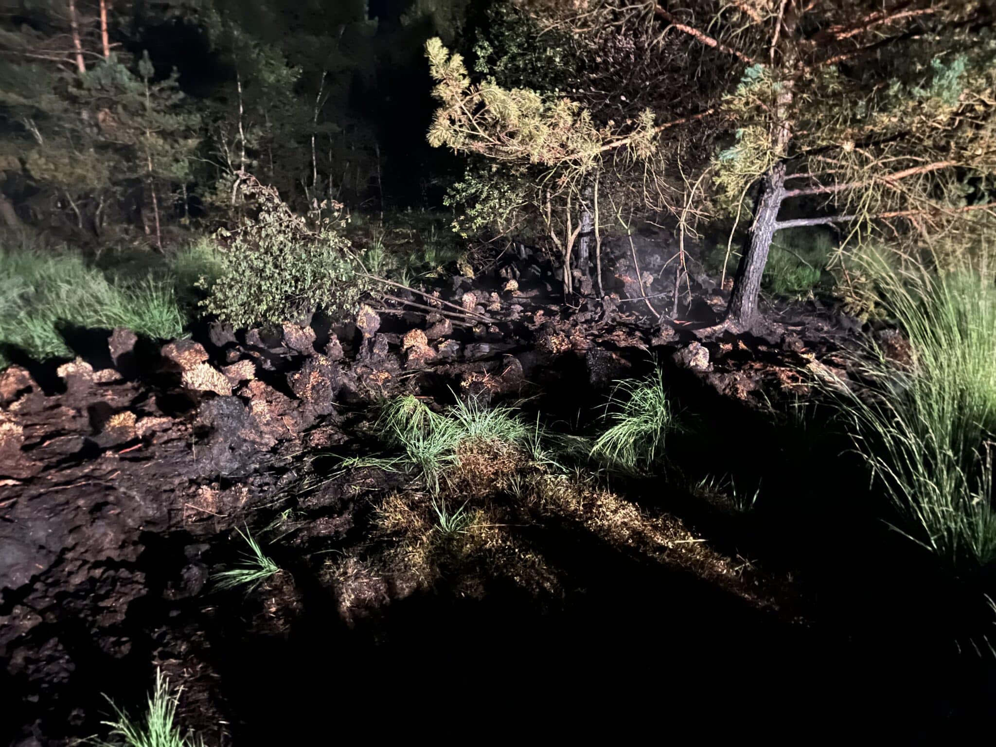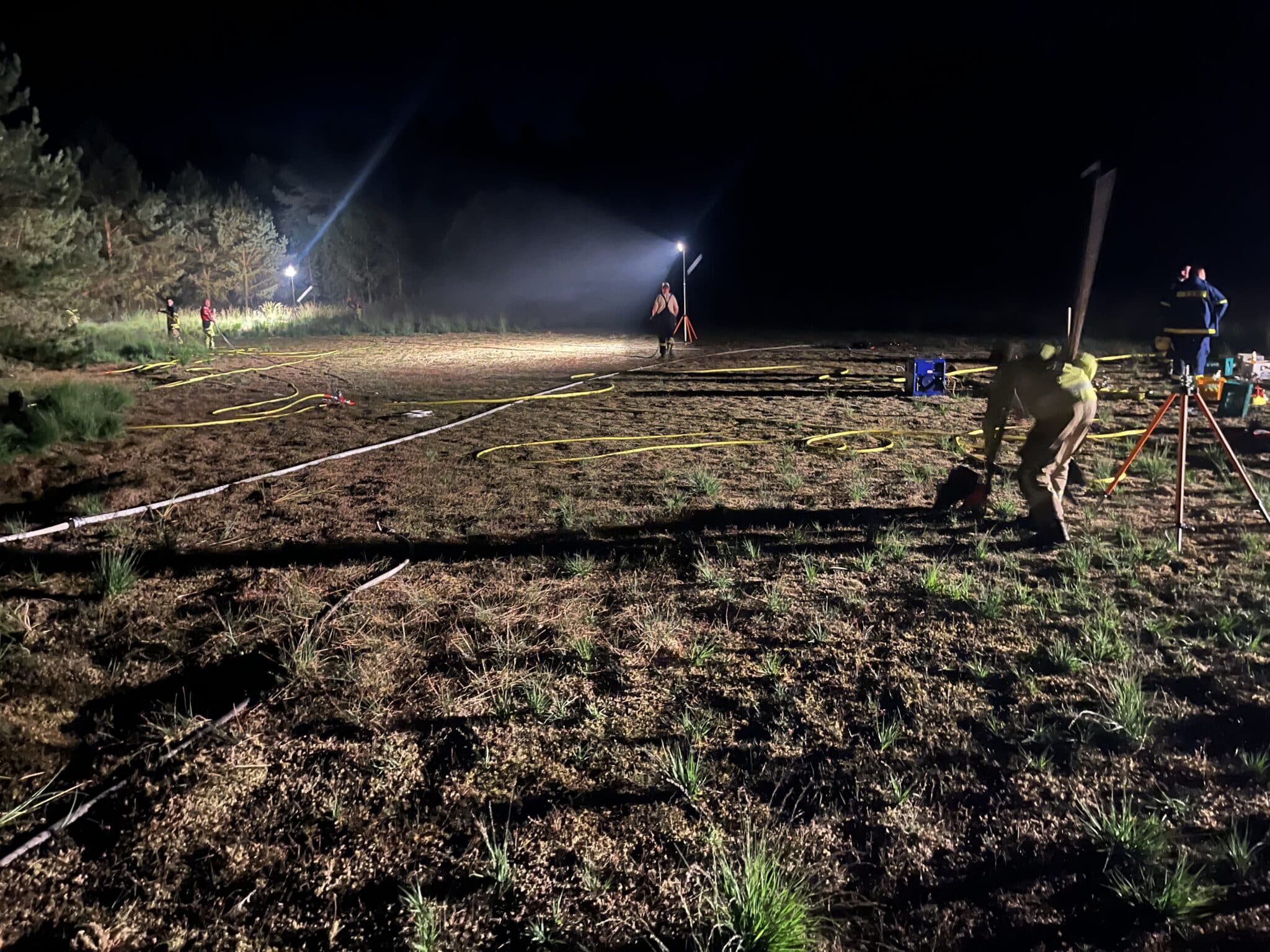 Zunächst konnte die Einsatzstelle im Wald nicht gefunden werden. Mit Hilfe unserer Drohne und der Wärmebildkamera konnte dann die Einsatzstelle lokalisiert werden. Diese befand sich auf Gildehauser Gebiet (Niedersachsen), so dass die Feuerwehr Bad Bentheim-Gildehaus alarmiert wurde. Die Größe der Einsatzstelle betrug ca. 3000 m².