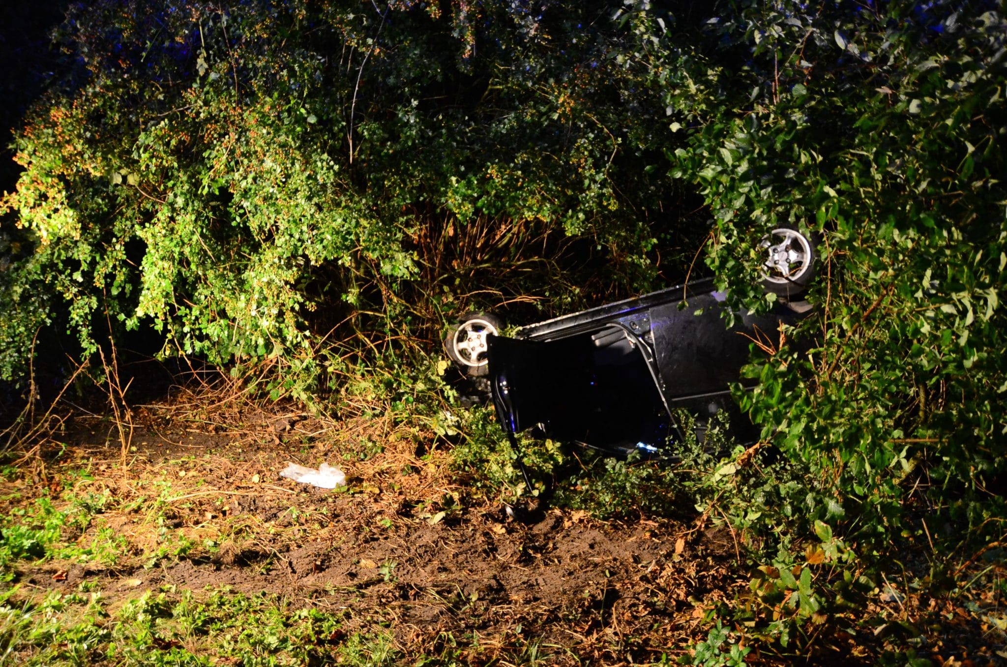 Die Feuerwehr und Polizei konnten das Fahrzeug kurz hinter der Abfahrt Gronau-West in einer Böschung ausmachen. Zusammen mit der Brandweer der Niederlande, die mittlerweile auch eingetroffen war, wurden die zwei Verletzten mittels Spinboard aus dem auf dem Dach liegenden Fahrzeug herausgeholt. Beide Personen waren nicht eingeklemmt. Nachdem die Verletzten durch den Rettungsdienst versorgt waren, wurden sie mit dem RTW und einem niederländischen Ambulance-Fahrzeug ins Medispectrum nach Enschede befördert.