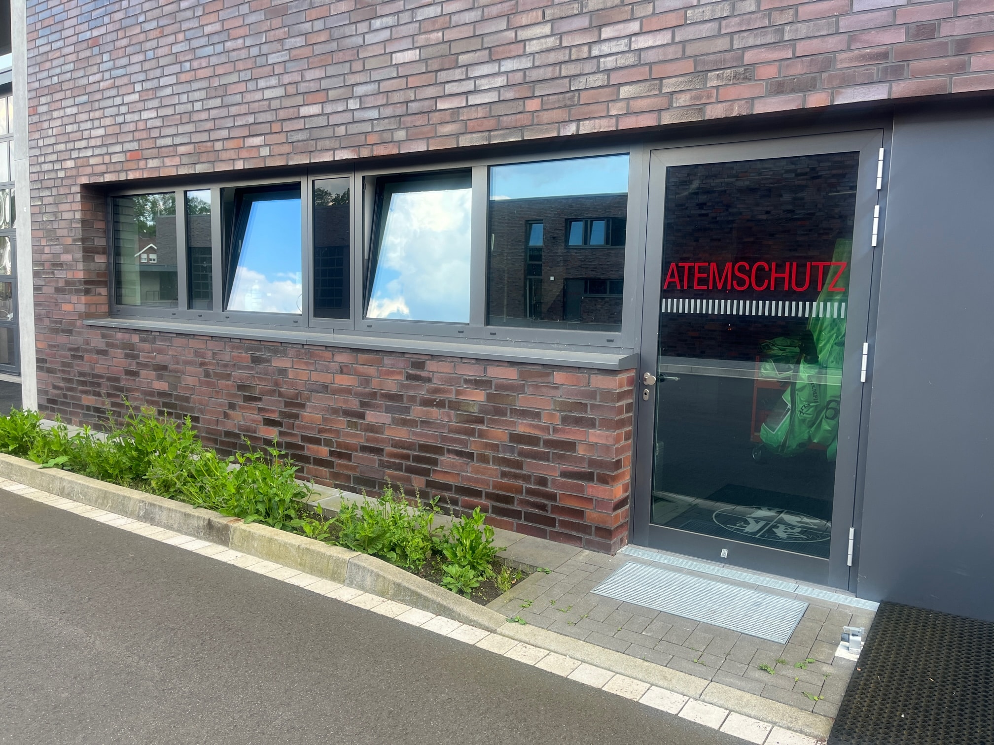 Hinter dieser Tür liegen einige der wichtigsten Räume an der Feuer- und Rettungswache. Der Schutz vor Atemgiften bei der Menschenrettung, der Brandbekämpfung oder dem Umgang mit gefährlichen Stoffen und Gütern hat bei der Feuerwehr einen sehr hohen Stellenwert, wollen wir doch alle wieder gesund vom Einsatz zurückkehren.