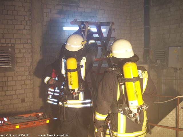 Als die Feuerwehr eintraf, wurden die Aufgaben schnell verteilt und innerhalb weniger Minuten waren die ersten Einsatzkräfte unter Atemschutz auf dem weg in den total verrauchten Glockenturm um den Küster zu retten und auch eine Brandausbreitung zu verhindern.