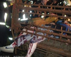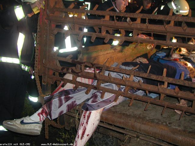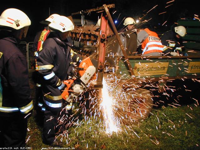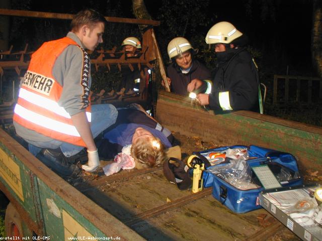 Während des normalen Übungsabends kam gegen 19:38 h die Meldung von der Leitstelle "Unfall bei einem landwirtschaftl. Betrieb; Person klemmt in Miststreuer". Der Löschzug Epe rückte mit allen Fahrzeugen aus. Vor Ort hatte Matthias Stehning das Opfer täuschend echt geschminkt. Beide Beine waren in dem Miststreuer eingeklemmt und mehrfach gebrochen. Die eintreffenden Kräfte begannen sofort mit der medizinischen Versorgung des Verletzten; gleichzeitig wurden die Einsatzstelle kpl. ausgeleuchtet. Der Motor des Traktors wurde ausgestellt und die Antriebskurbel getrennt. Nachdem der Miststreuer mit Unterlegkeilen gesichert war wurde mit einem Trennschleifer die Zahnwelle durchtrennt, so daß der Verletzte befreit werden konnte. Die Übung war von Wolfgang Bräuer hervorragend vorbereitet worden.
