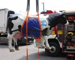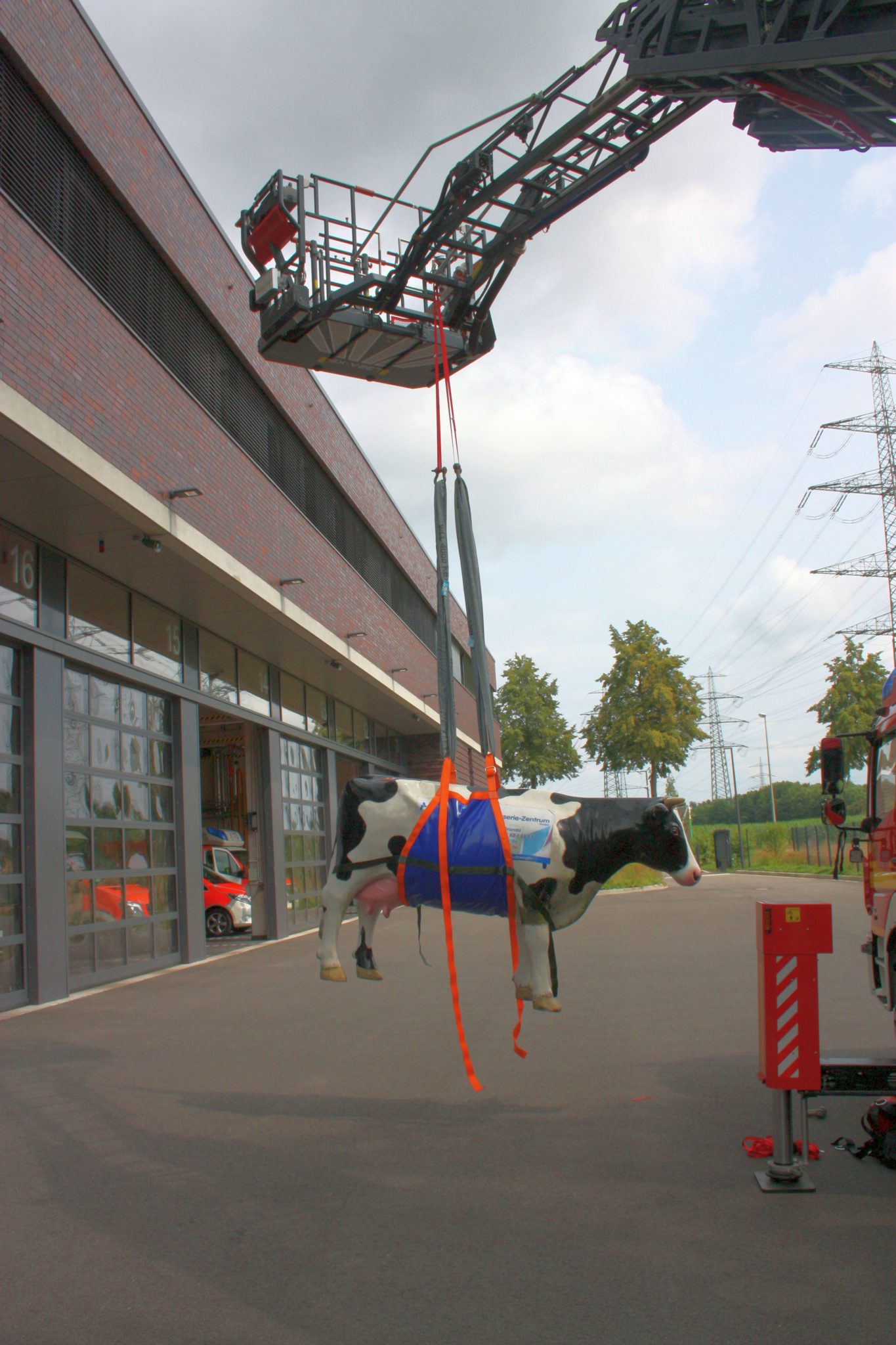Das Lackierzentrum „Lingen“ hat der Feuerwehr Gronau zur Übung mit dem Hebegeschirr die Dekorationskuh zur Verfügung gestellt. Hier konnten die Feuerwehrleute das Anlegen des Geschirrs sowie das Anheben des Tieres, hier mit der Drehleiter, üben.