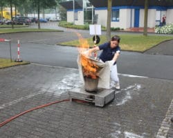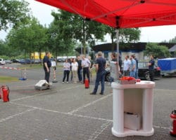 In verschiedenen Gruppen konnten dann die Teilnehmer den richtigen Umgang mit Feuerlöschern erlernen. Auch das praktische Üben mit einer Feuerlöschdecke wurde von den Beteiligten gut angenommen.