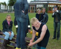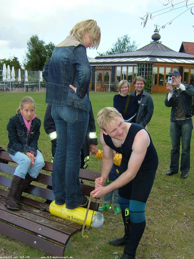 Nachdem Sebastian Vogel seine Frau Andrea letzte Woche kirchlich geheiratet hat wurde diesen Samstag das Hochzeitsgeschenk seiner Kollegen von der Taucherstaffel der Feuerwehr Gronau eingelöst. Seine Aufgabe war es, vom Grund des Drilandsees eine ausgediente Atemluftflasche, die vorher präpariert worden war, zu suchen um sie dann an der Wasseroberfläche aufzusägen. Nur so kam er an sein Geschenk heran.