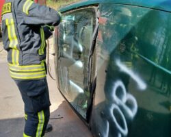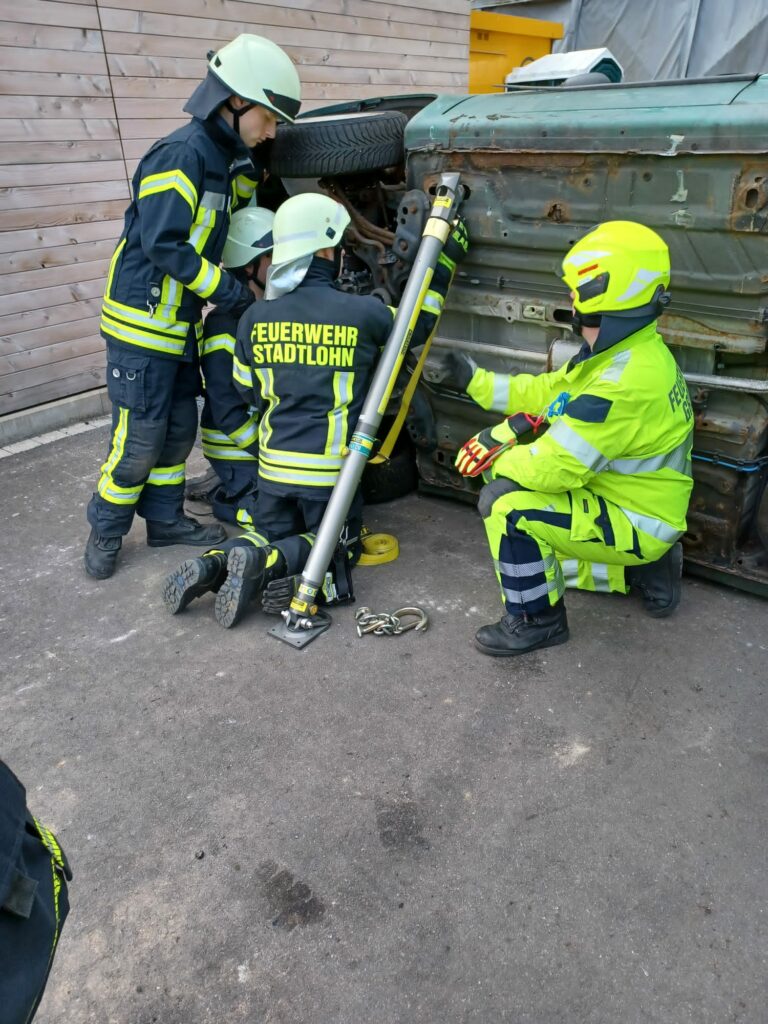 Der Samstag war dann der Praxis vorbehalten. Hier hatten die Ausbilder verschiedene Unfallfahrzeuge besorgt, wo dann die Stabilisierung von Fahrzeugen in verschiedenen Positionen geübt wurde. Auch die richtige Handhabung von Hebekissen im Einsatz wurde aufgefrischt.  Die Ansatzpunkte für das Einsetzen von hydraulischem Rettungsgerät vermittelten die Ausbilder, so dass jeder anschließend die Theorie in die Praxis umsetzen konnte.