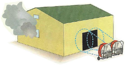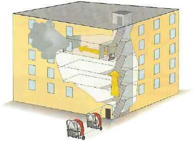 Um die Gefahr durch Rauchgase und Explosion in einem brennenden Gebäude herabzusetzen werden sogenannte Hochleistungslüfter eingesetzt. Sie werden im passenden