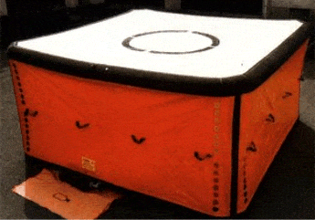 Nachdem die Druckluftflasche geöffnet wurde, rollt sich das Sprungpolster automatisch aus und richtet sich selbsttätig auf. Aufrichtungszeit ca. 30 Sek. Übermengen an Druckluft strömen über das im oberen Schlauchwulst eingebaute Sicherheitsventil (Überdruckventil) ab.