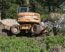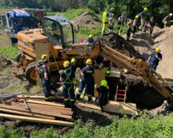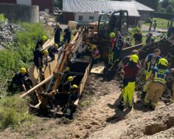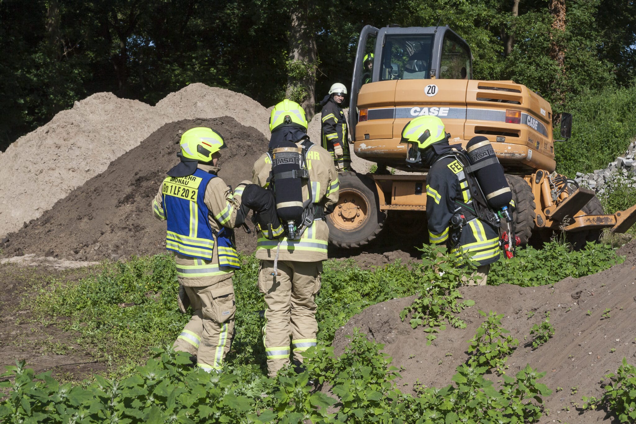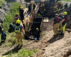 Der Baggerfahrer war noch schwer verletzt in seinem Fahrzeug, das jedoch zunächst stabilisiert werden musste, da nur 2 Räder den Boden berührten und schwankend an der Baugrube stand.