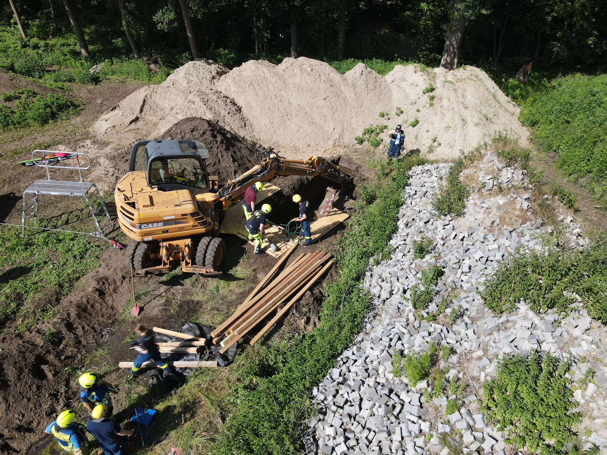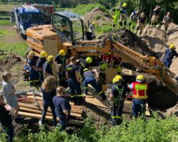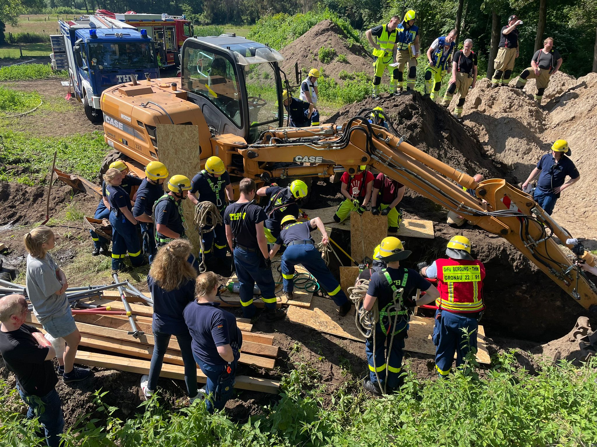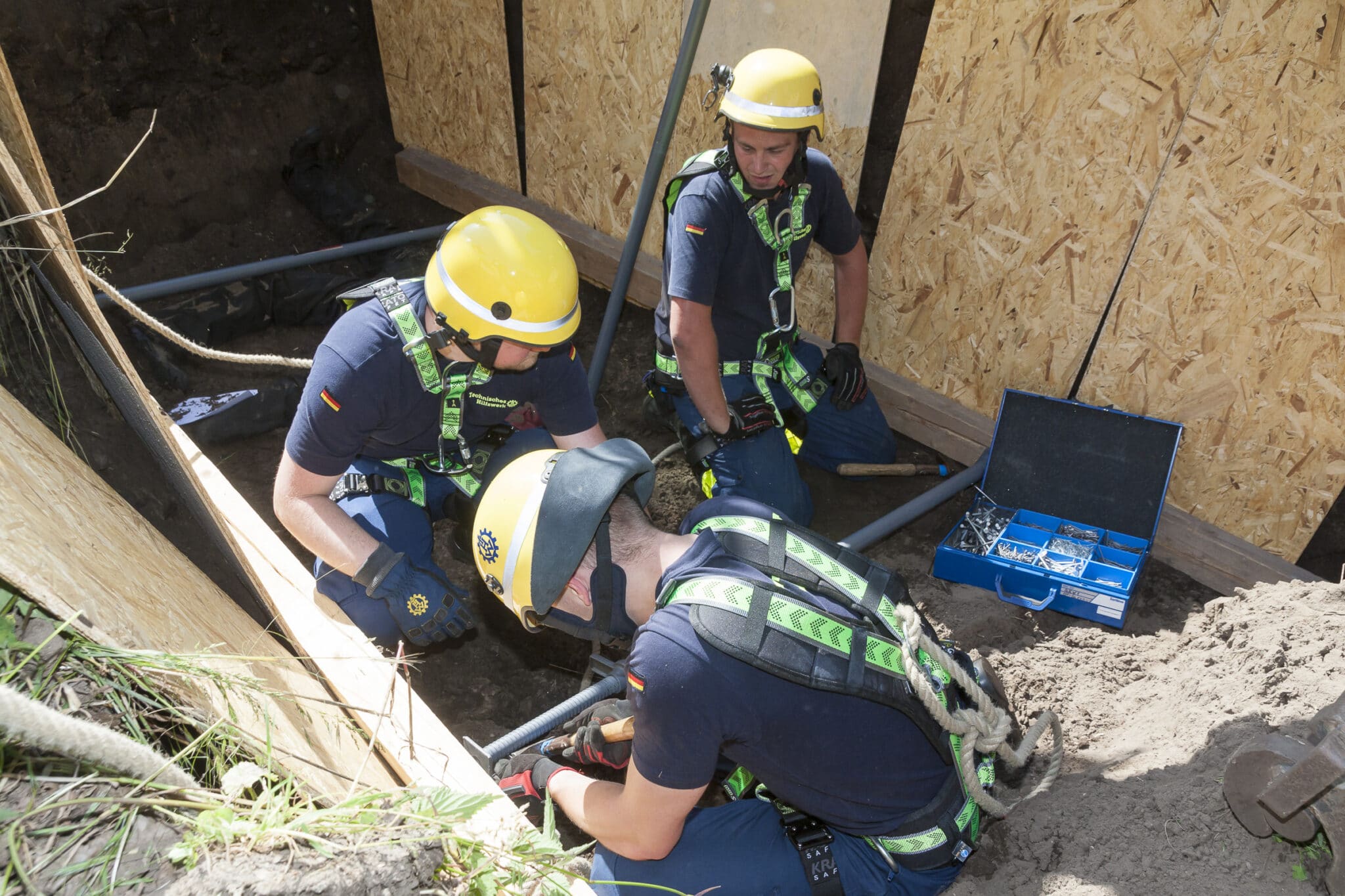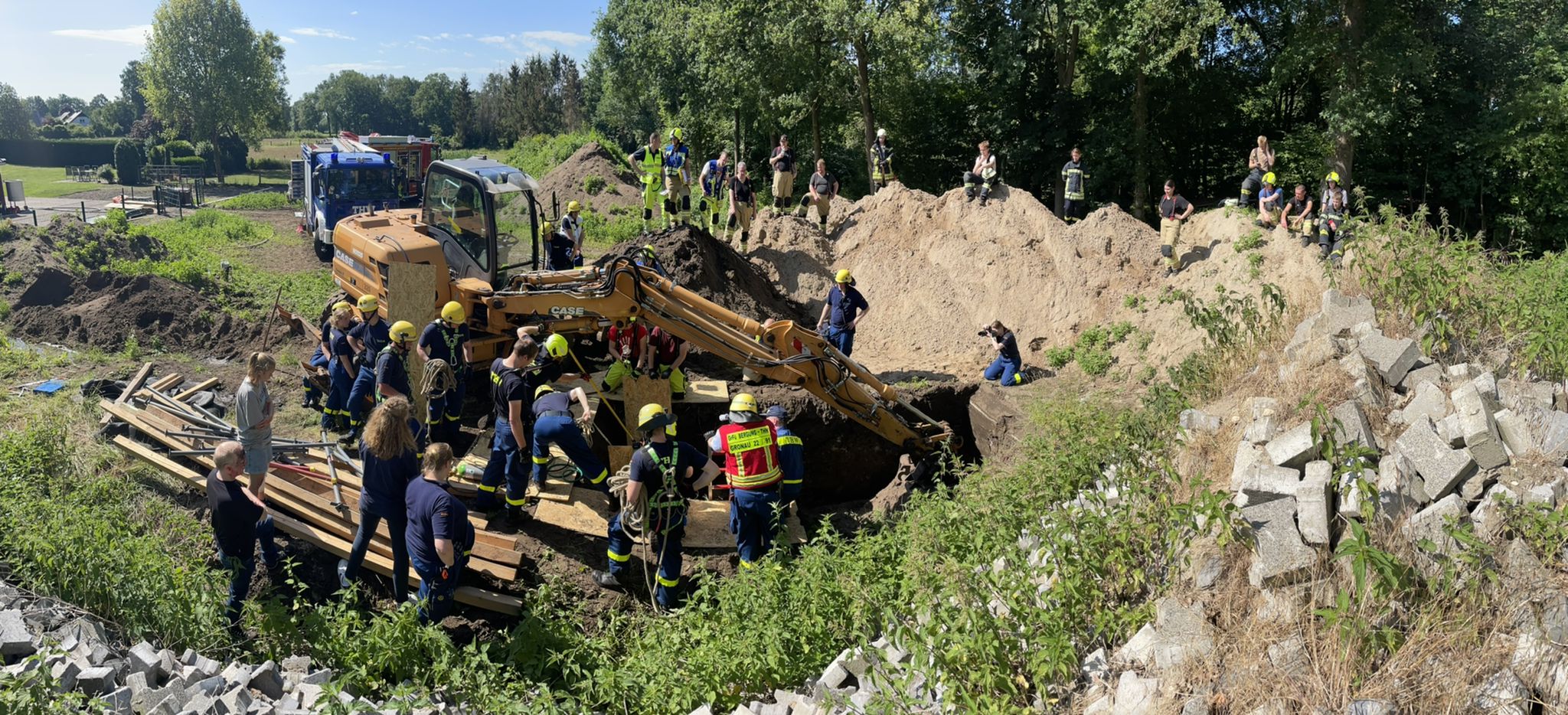 Anschließend wurde die Person aus der Baugrube geborgen. Hierzu musste die ca. 2 Meter tiefe Baugrube zunächst gegen Einsturz gesichert werden.