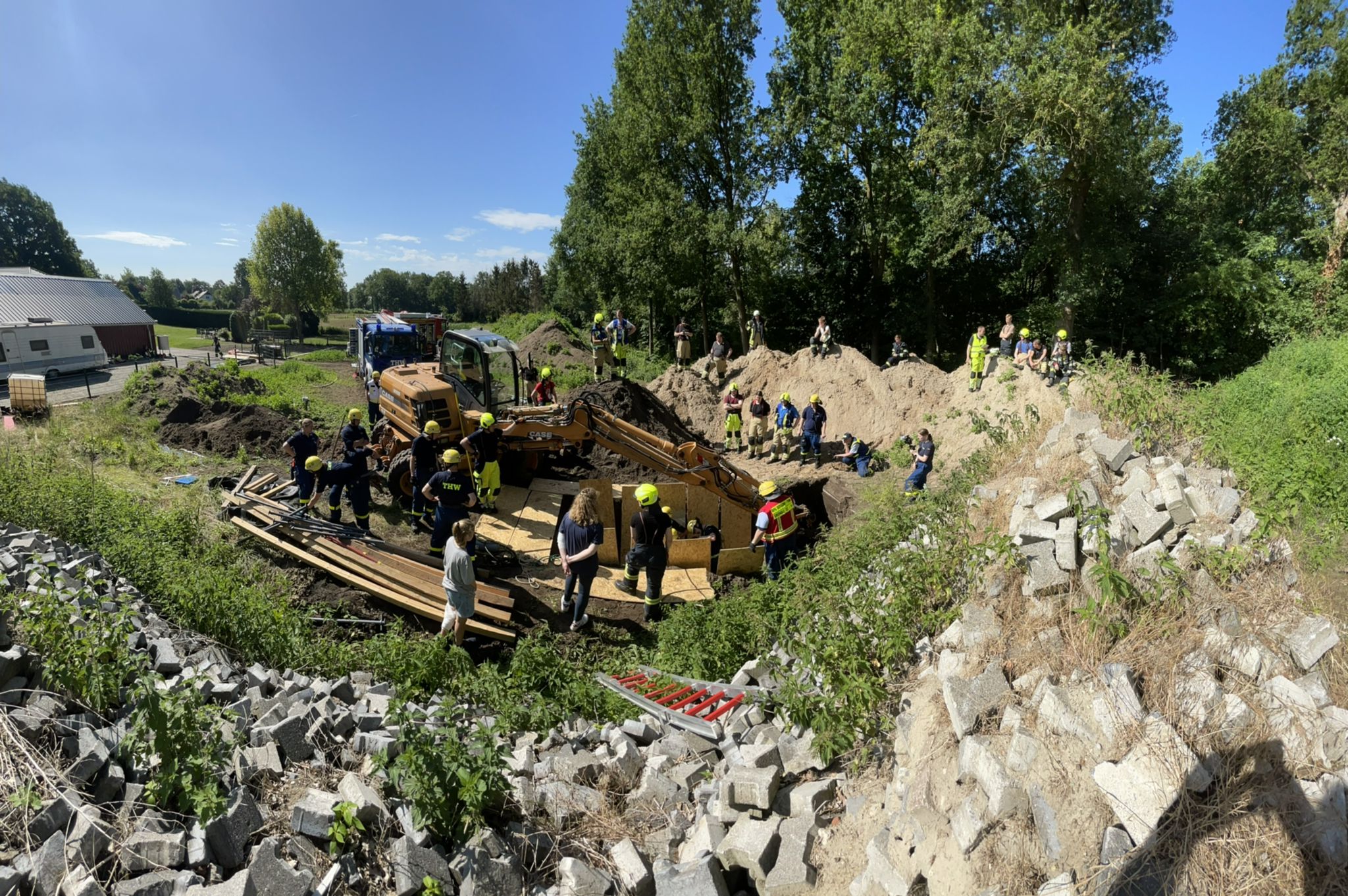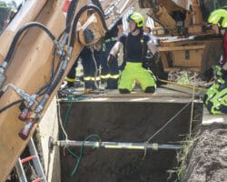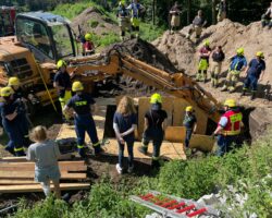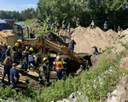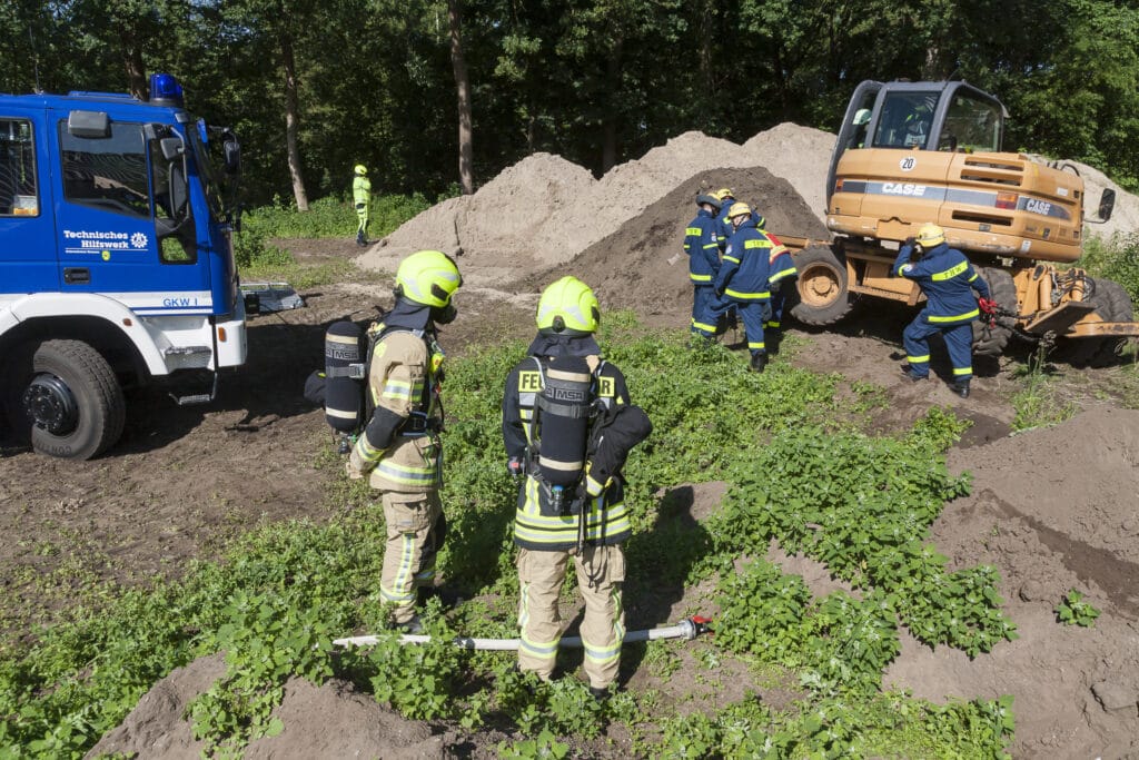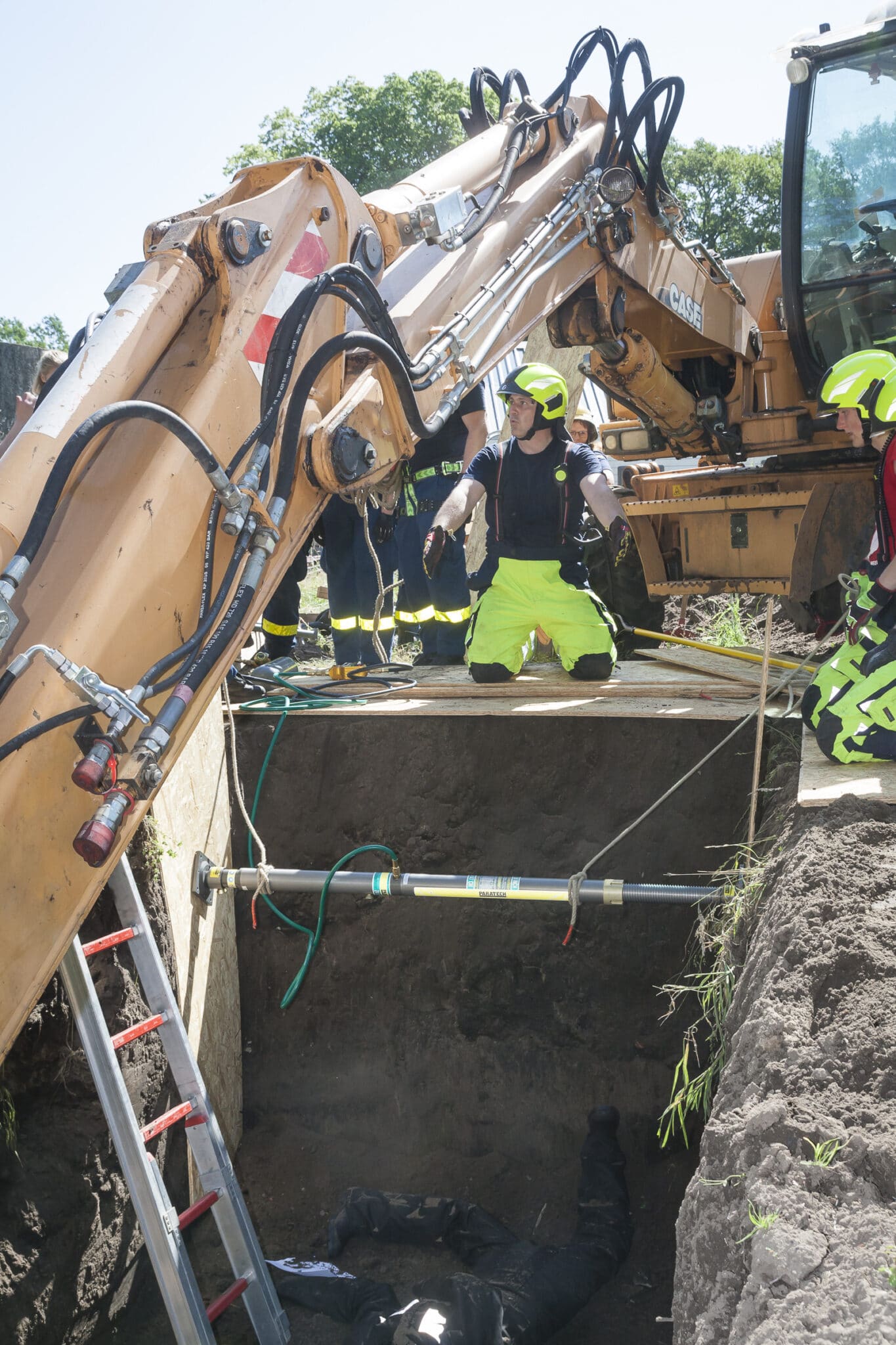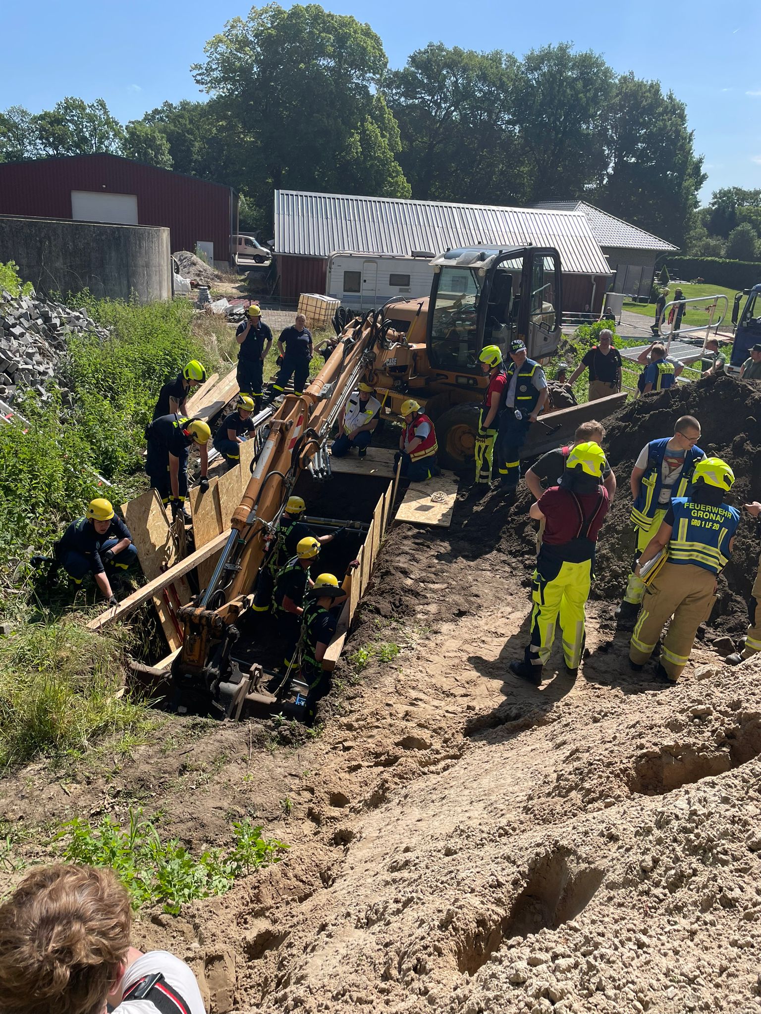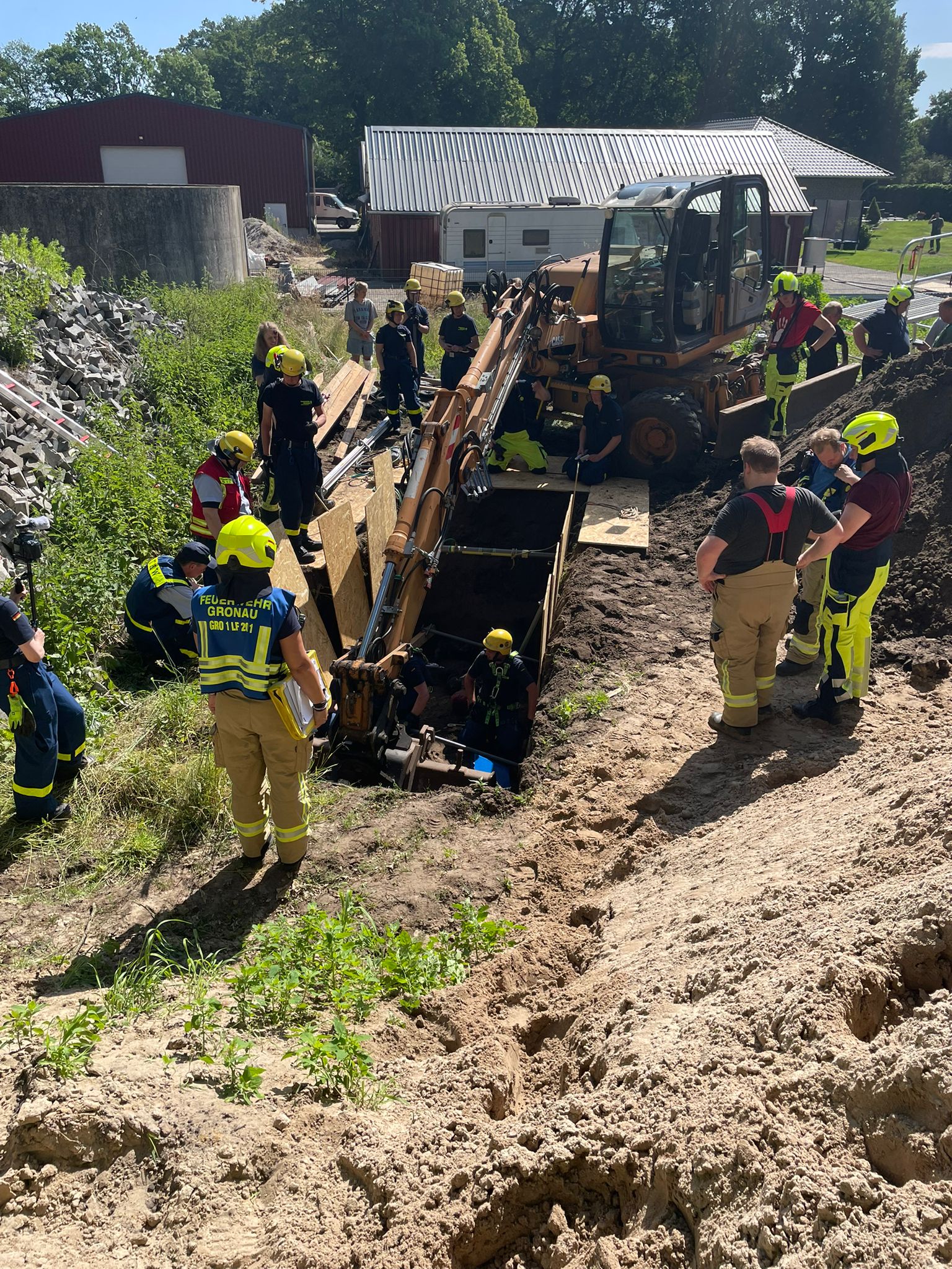 Anschließend wurde die Person aus der Baugrube geborgen. Hierzu musste die ca. 2 Meter tiefe Baugrube zunächst gegen Einsturz gesichert werden.