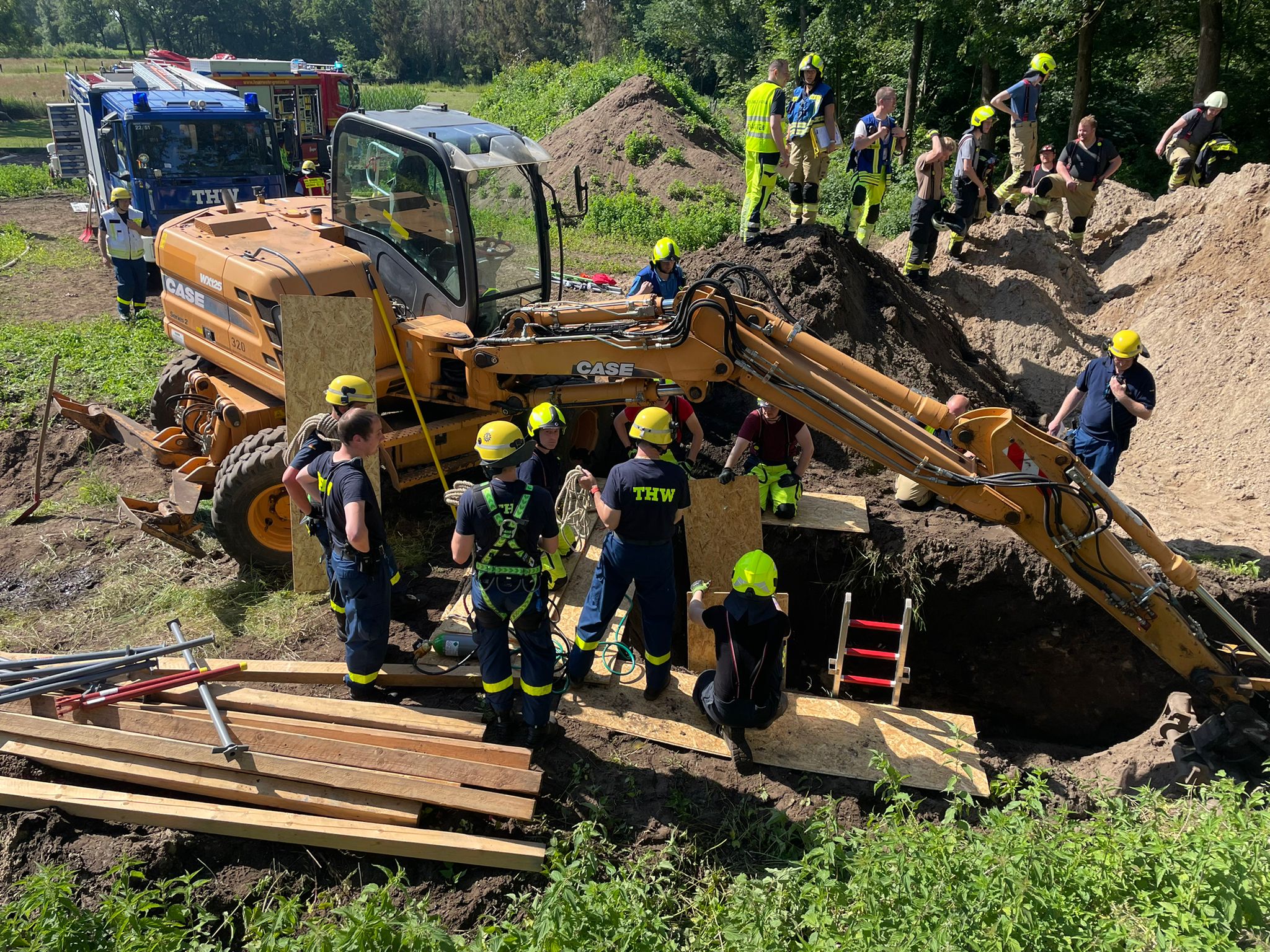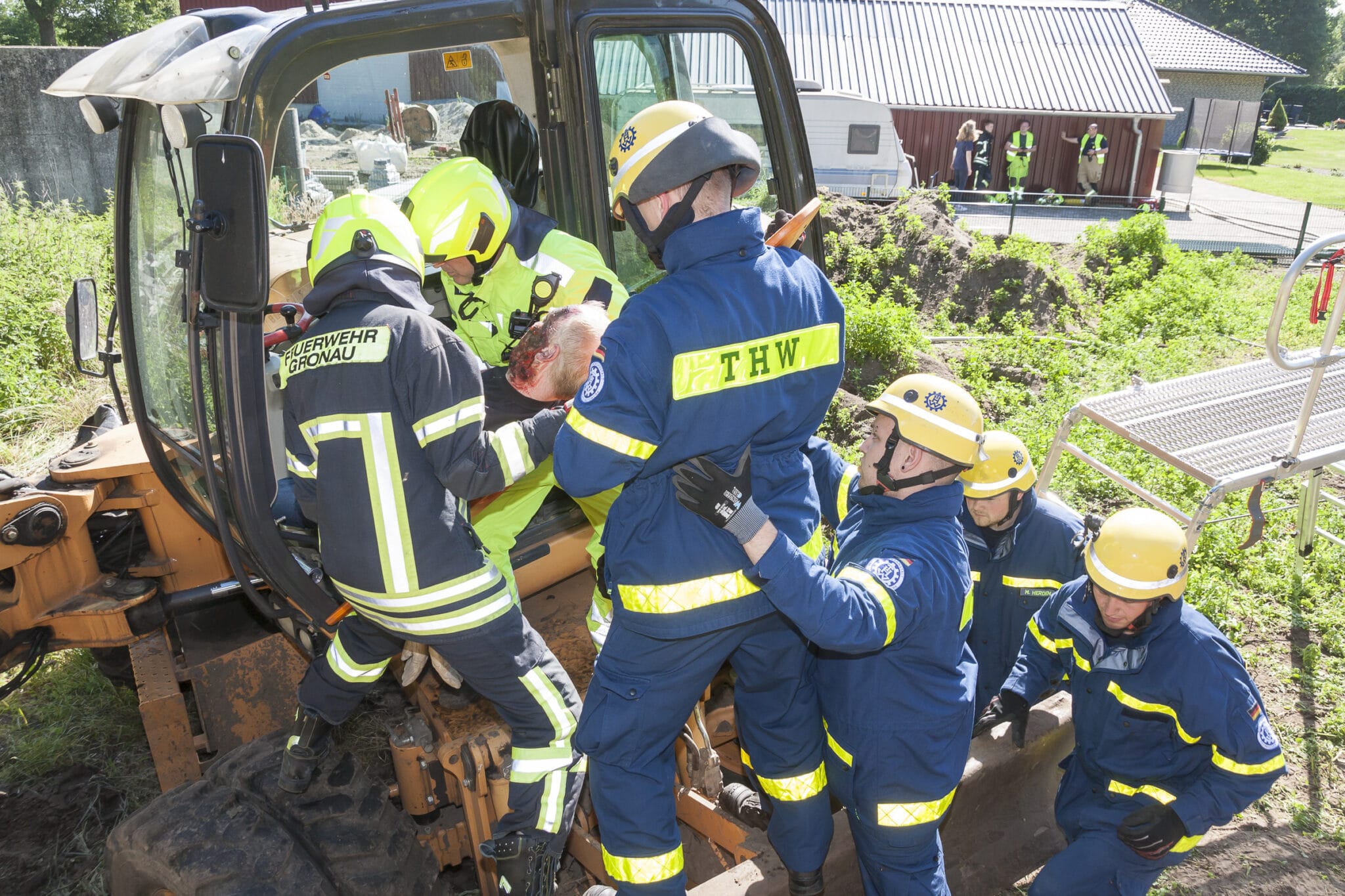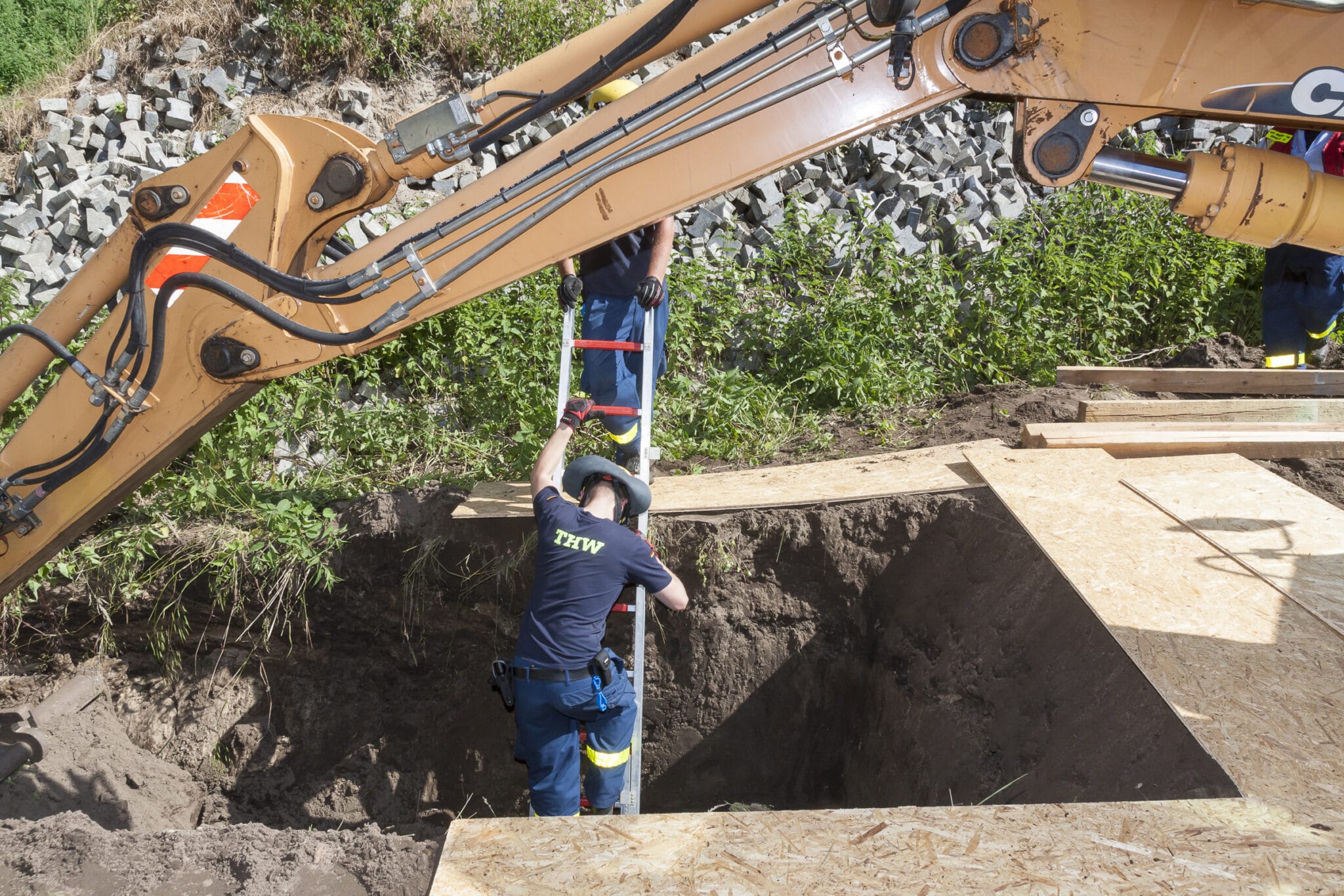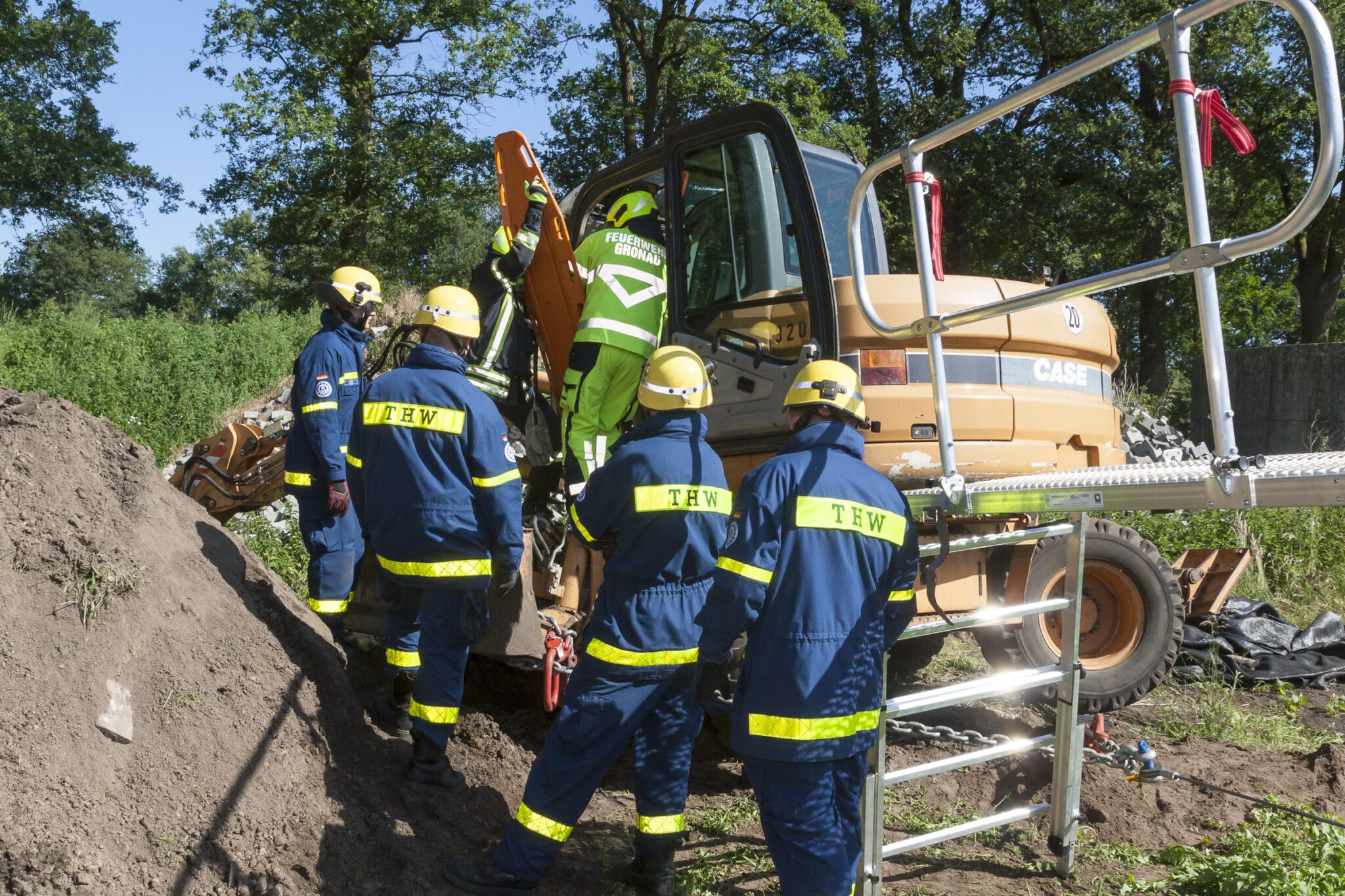 Aufgrund der Einsatzsituation wurde das Technische Hilfswerk mit der Bergungsgruppe zur Einsatzstelle alarmiert. Vom THW wurde zunächst der Bagger unterbaut und mit der Seilwinde stabilisiert. Gemeinsam konnte dann der Baggerfahrer aus dem Baugerät gerettet werden.