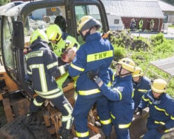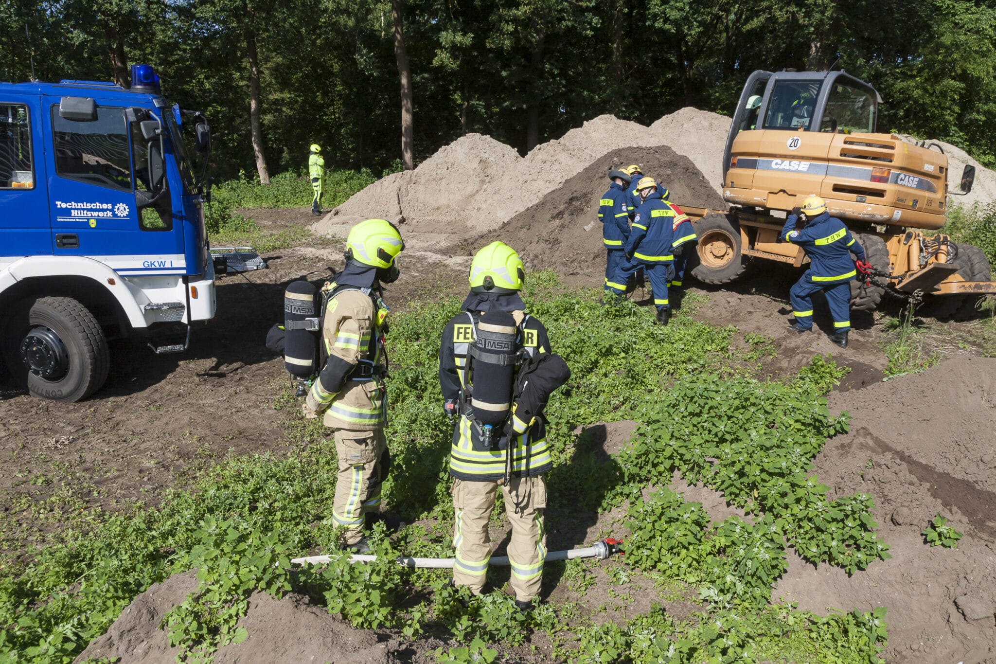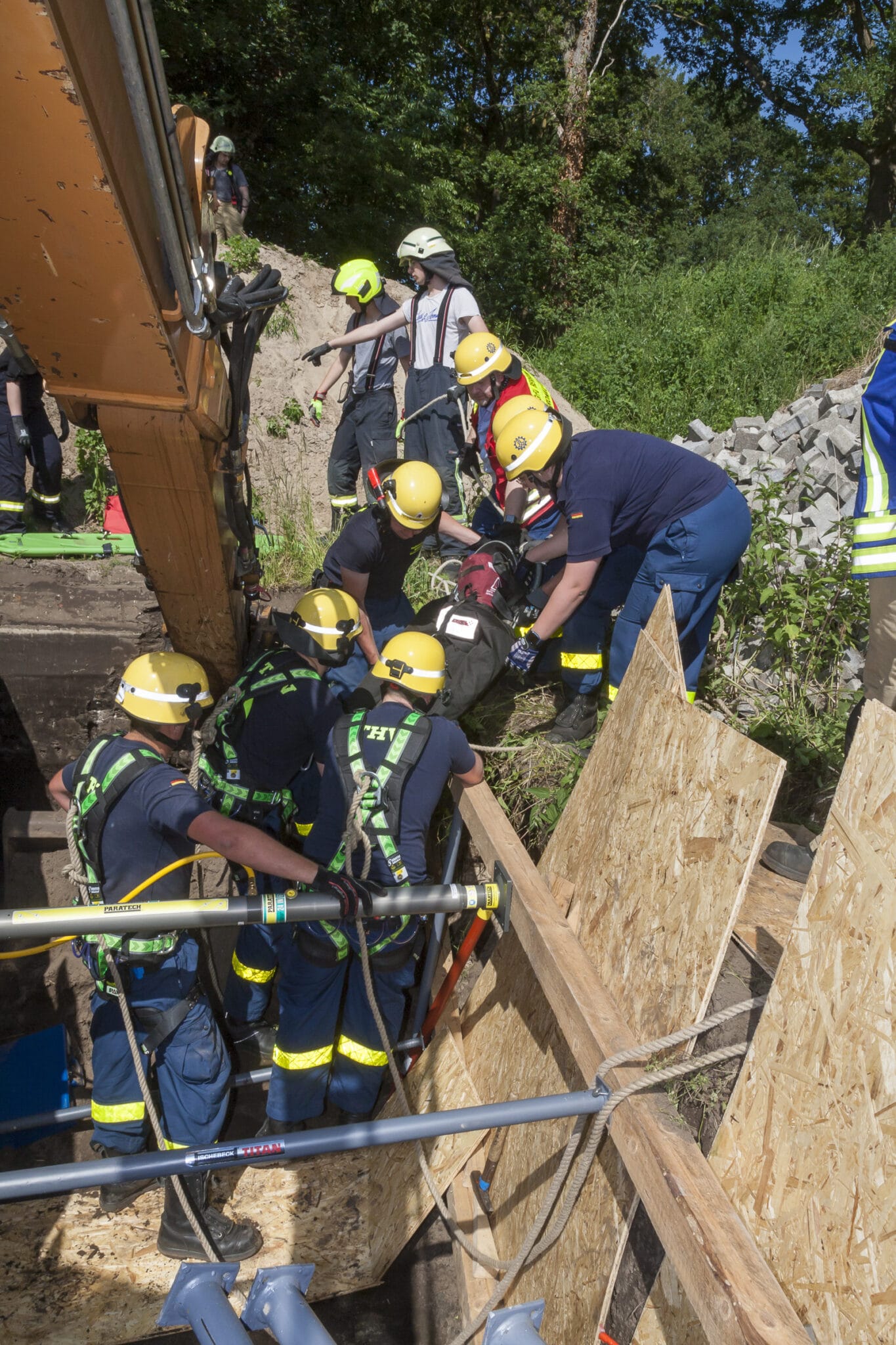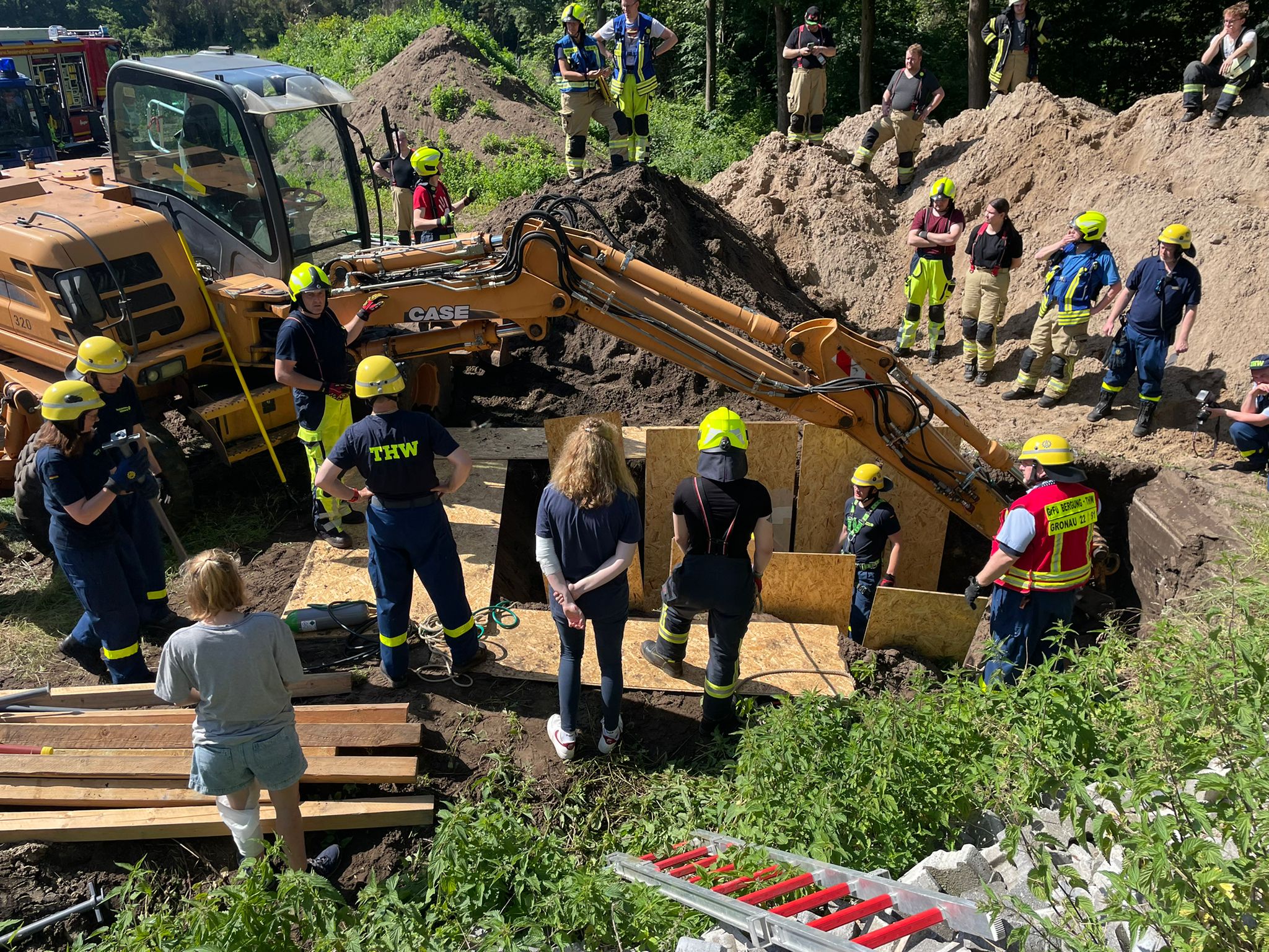 Aufgrund der Einsatzsituation wurde das Technische Hilfswerk mit der Bergungsgruppe zur Einsatzstelle alarmiert. Vom THW wurde zunächst der Bagger unterbaut und mit der Seilwinde stabilisiert. Gemeinsam konnte dann der Baggerfahrer aus dem Baugerät gerettet werden.
