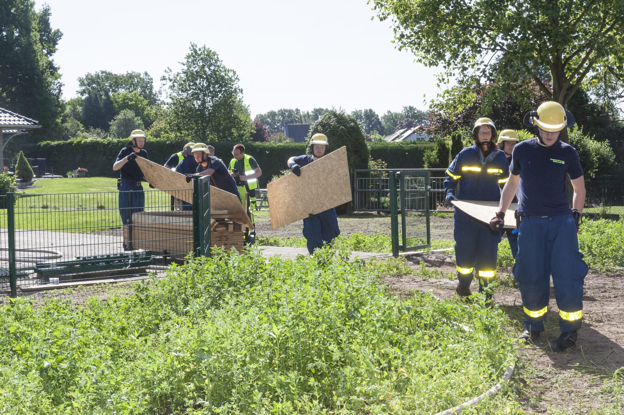Unter Realbedingungen wären zusätzlich noch hauptamtliche Kräfte der Feuerwehr, des Rettungsdienstes, evtl. Hubschrauber, Polizei, Ordnungsamt und Stadtwerke an der Einsatzstelle.