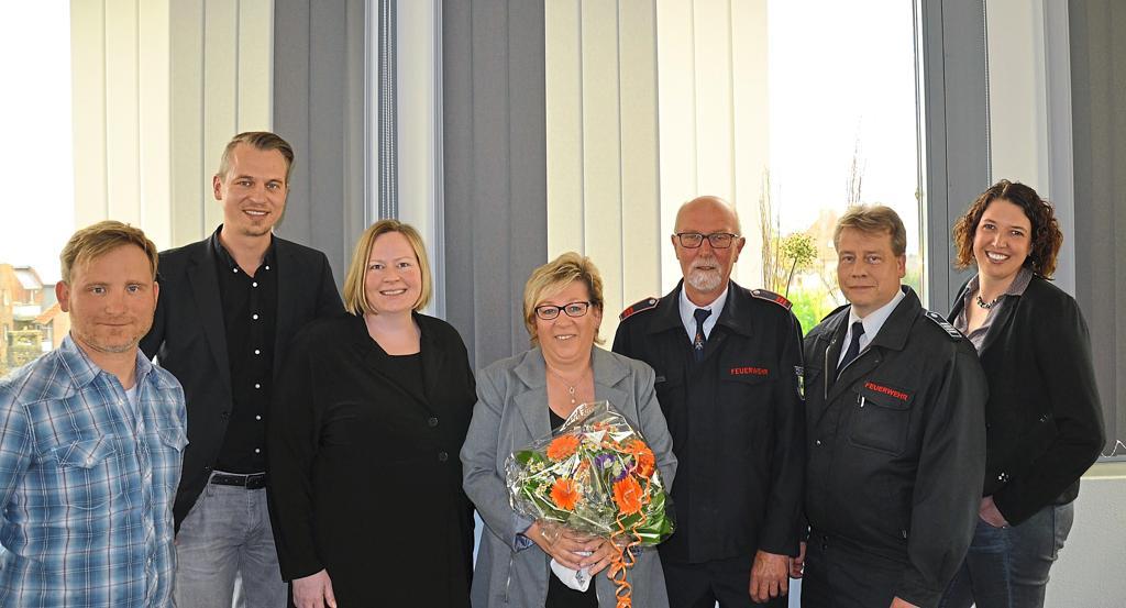 Bürgermeisterin Sonja Jürgens (3. von links) verabschiedete Hauptbrandmeister Günter Setzpfand (3.v.r., zusammen mit Ehefrau Susanne) in den wohlverdienten Ruhestand. Den besten Wünschen für die Zukunft schlossen sich Sebastian Vogel (Vertreter des Personalrats, links), Rainer Hoff (kommissarischer Leiter des Fachdienstes Sicherheit und Ordnung, 2.v.l.), Marco van Schelve (Leiter der Feuer- und Rettungswache, 2.v.r.) und Julia Neumüller (kommissarische Leiterin des Sachgebiets Personal, rechts) an.