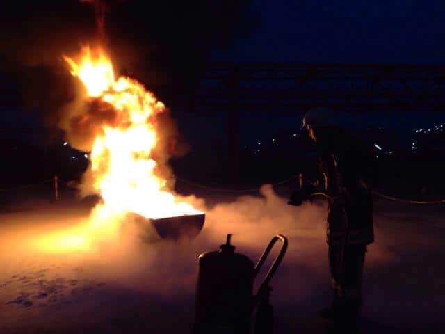 Hier konnten die Feuerwehrleute auf einem Übungsgelände die Vorgehensweise und Brandbekämpfung bei Flüssigkeitsbränden trainieren. Hierzu wurden verschiedene Flüssigkeiten in einer grossen Wanne in Brand gesetzt. Danach galt es die Flammen mit diversen Pulverlöschgeräten zu ersticken, die Bandbreite reichte dabei vom einfachen 5 kg Löscher bis hin zum 250 kg Anhänger.