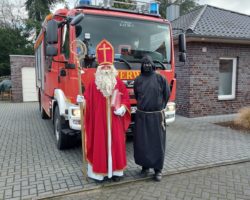 Der Nikolaus und sein Knecht Ruprecht wurden mit einem großen Feuerwehrfahrzeug zu den Feuerwehrfamilien gefahren. Dort angekommen überraschte er die Kinder, die coronabedingt gar nicht mit dem Nikolaus gerechnet hatten. Damit auch hier alle Regeln eingehalten wurden, blieb der Nikolaus vor der Haustür stehen. Umso schöner war es, dass der Nikolaus zu jedem einzelnen Kind noch einiges zu berichten hatte. Sei es das unaufgeräumte Zimmer, die vergessenen Schulaufgaben oder der kleine Streit unter Geschwistern. Die Kinder waren überrascht, was der Nikolaus doch so alles wusste. Mit kleinen Ermahnungen war es dann aber auch getan. Die erhoffte Tüte mit Leckereien konnte dann allen Kindern vom Nikolaus überreicht werden.