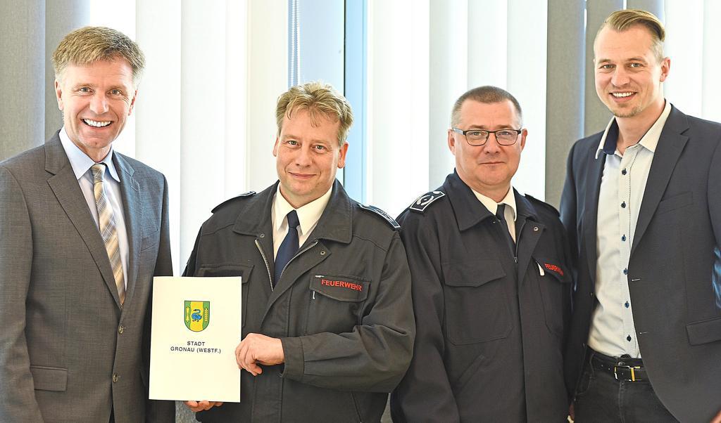 Bürgermeister Rainer Doetkotte überreichte jetzt dem (alten und) neuen Leiter der Freiwilligen Feuerwehr Gronau die Ernennungsurkunde. Marco von Schelve ist damit – unter Berufung in das Ehrenbeamtenverhältnis auf Zeit – weitere sechs Jahre Leiter der Freiwilligen Feuerwehr. Auf dem Bild (v.l.): Bürgermeister Rainer Doetkotte, Marco van Schelve, Herbert Kleine (stellvertretender Leiter der Freiwilligen Feuerwehr) und Rainer Hoff (Fachdienst Sicherheit und Ordnung).