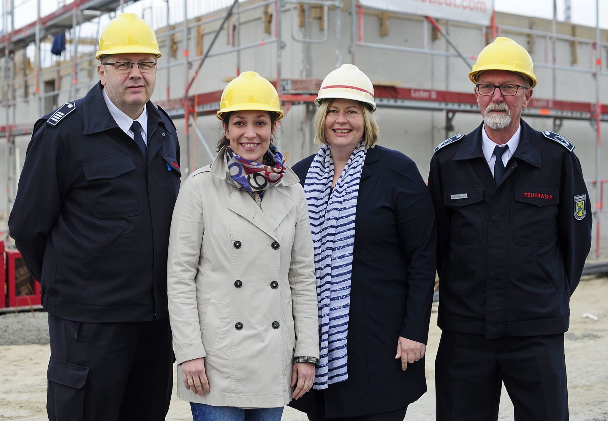 Zum Besuch der Landtagsabgeordneten Heike Wermer (CDU), 2.v.l., im Rahmen der „Woche der Feuerwehr“ zählte nicht nur das intensive Gespräch mit (v.l.) Matthias Stehning, Bürgermeisterin Sonja Jürgens und Günter Setzpfand, sondern auch die Besichtigung der im Bau befindlichen neuen Feuer- und Rettungswache Gronau, dessen erster Bauteil bis Ende 2019 fertig gestellt werden soll. Foto: Stadt Gronau