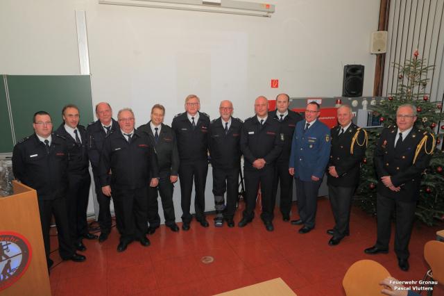 Marco van Schelve, Leiter der Feuerwehr Gronau, ließ in seiner Laudatio das Feuerwehrleben von Günter Meyer noch einmal Revue passieren. Vor 48 Jahren trat Günter Meyer 1968 in die Jugendfeuerwehr Gronau ein. Seine Begeisterung bei der Feuerwehr fand 1978 einen weiteren Höhepunkt, als Günter Meyer sein Hobby zum Beruf machte. Unzählige Lehrgänge, Seminare und Fortbildungen absolvierte Günter Meyer in den Jahren um sich höher zu qualifizieren aber auch um neuen Feuerwehrleuten das erlernte Wissen weiterzugeben. Stellvertretender Löschzugführer, Löschzugführer, stellvertretender Leiter der Feuerwehr und Leiter der Feuerwehr waren die höchsten Ämter die Günter Meyer mit Zuspruch der Mannschaft ausfüllte. Mein Löschzug und meine Feuerwehr waren Aussprüche, die von der Mannschaft in „Günters Löschzug“ und „Günters Feuerwehr“ umgemünzt wurden. Neben der Feuerwehrarbeit war Günter Meyer einer der Organisatoren des internationalen Feuerwehrsportfestes. Unter seiner Federführung wurde im Jahre 2006 das Festbuch zum 125 jährigem Jubiläum geschrieben. Günter Meyer ist seit Gründung des Kameradschaftsvereins im Jahre 2002 Vorsitzender. Die erfolgreichen Wasserspiele der Feuerwehr wurden mit seinem Engagement und Wissen zu dem Highlight welches sie heute darstellen. Unzählige Fahrzeuge und Geräte wurden unter der Regie von Günter Meyer angeschafft. Aber auch bei dem städtischen Geschenk, eine Drehleiter an die Partnerstadt Mezöbereny in Ungarn, im Jahre 1993, war Günter Meyer aktiv.
