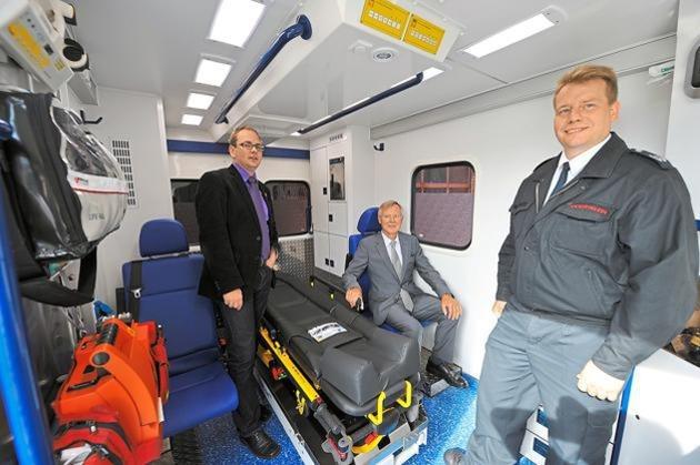 Nagelneu sieht er aus. Ist es aber nur zum Teil. Der „neue“ Rettungswagen (RTW), der am Donnerstagmorgen an der Feuer- und Rettungswache in Dienst gestellt wurde, ist vielmehr ein Mix aus neu und gebraucht. „Das Besondere an diesem Fahrzeug ist, dass das Fahrgestell neu ist, der alte Koffer – also der Aufbau – aber neu aufgearbeitet wurde und weiter verwendet wird“, erklärt Carsten Thien, Mitarbeiter des Fachdienstes Sicherheit und Ordnung beim Kreis Borken. Gemeinsam mit dem stellvertretenden Landrat Karlheinz Busen übergab Thien am Donnerstag die Schlüssel für den RTW an Feuerwehr-Chef Marco van Schelve.