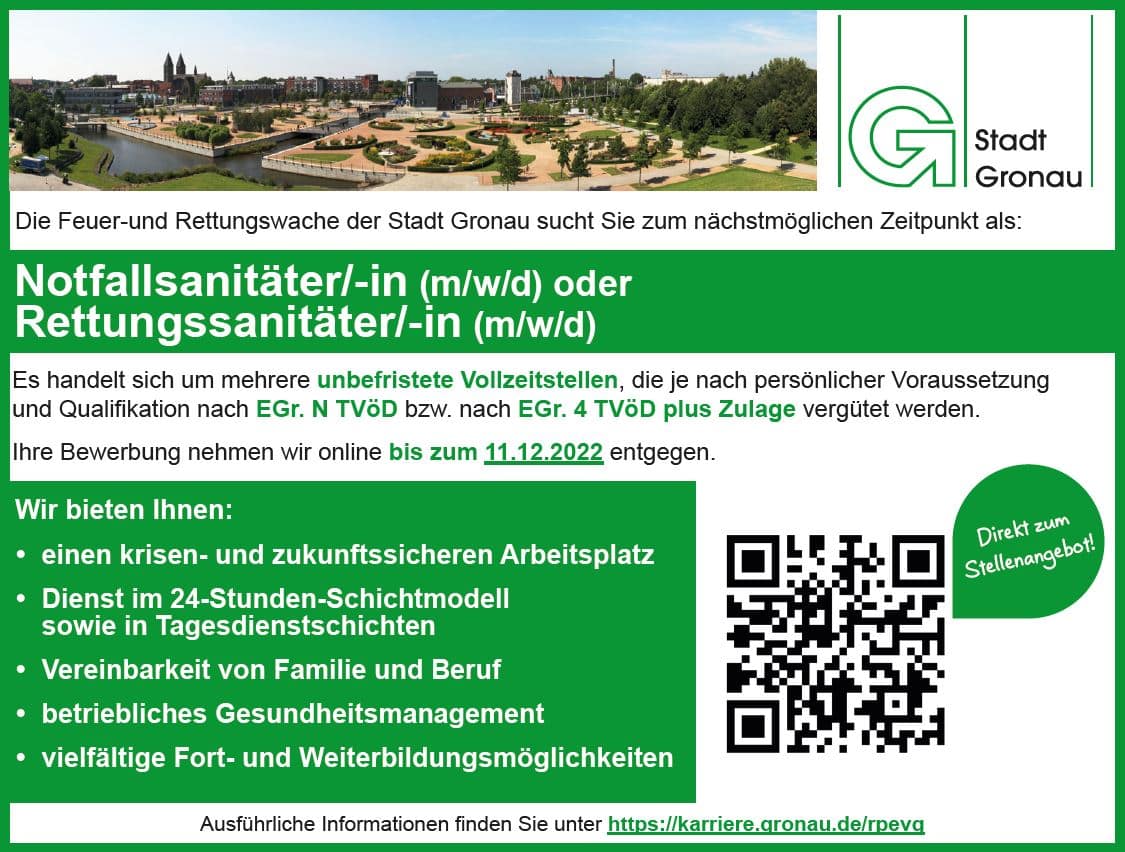 Notfallsanitäter/Rettungssanitäter gesucht Von: Martin Lammers 26. November 2022 weitere Infos auf der Seite der Stadt Gronau