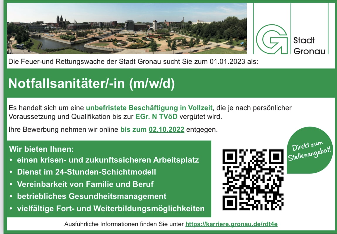Notfallsanitäter gesucht Von: Martin Lammers 9. September 2022 Die Stadt Gronau sucht Dich als Notfallsanitäter. Weitere Infos auf www.gronau.de/jobs