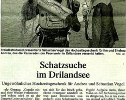 Nachdem Sebastian Vogel seine Frau Andrea letzte Woche kirchlich geheiratet hat wurde diesen Samstag das Hochzeitsgeschenk seiner Kollegen von der Taucherstaffel der Feuerwehr Gronau eingelöst. Seine Aufgabe war es, vom Grund des Drilandsees eine ausgediente Atemluftflasche, die vorher präpariert worden war, zu suchen um sie dann an der Wasseroberfläche aufzusägen. Nur so kam er an sein Geschenk heran. Diese Aufgabe…
