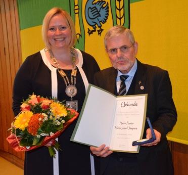 Pfarrer Hans-Josef Jaspers wurde für seine besonderen Verdienste im sozialen Bereich mit der Stadtplakette der Stadt Gronau ausgezeichnet. Seit vielen Jahrzehnten ist Pfarrer Jaspers als Notfall- und Feuerwehr-Seelsorger in schwieriger seelsorgerischer, caritativer und sozialer Mission tätig.Am 6. September 1987 wurde Pfarrer Jaspers als Pfarrer der Pfarrgemeinde St. Antonius in Epe eingeführt. „Seitdem kümmerten sich in vorbildlicher Weise um die Menschen in Ihrer Gemeinde, die keine Fürsprecher mehr fanden und nach Hilfe suchten“, so Bürgermeisterin Sonja Jürgens.Zum Ende seiner aktiven Zeit als Pfarrer wurde die St. Antonius-Kirche in Epe abgerissen und es kam zu einer Fusion der Pfarrgemeinden. „In dieser schwierigen Zeit einen Ausgleich zu schaffen, war sicherlich nicht einfach, doch Sie haben diese Phase eindrucksvoll gemeistert“, resümierte Jürgens.1999 war Pfarrer Jaspers einer der Mitbegründer der Notfallseelsorge im Kreis Borken. 1996 trat Jaspers in die Freiwillige Feuerwehr ein. „Sie waren Tag und Nacht abrufbereit und sofort zur Stelle, wenn sich eine besondere Notsituation ergab und seelsorgerische Hilfe gefragt war. Beispielhaft möchte ich Ihre Einsätze bei der Explosion der Feuerwerksfabrik in Enschede und bei der Massenkarambolage auf der A 31 nennen“, so Bürgermeisterin Sonja Jürgens.Jürgens erinnerte außerdem an seine Unterstützung der Hilfsmaßnahmen für Litauen, seine Spendensammlungen mit der Drehorgel und die Mitgliedschaft im Jugendhilfeausschuss von 1994 bis 2009.
