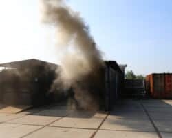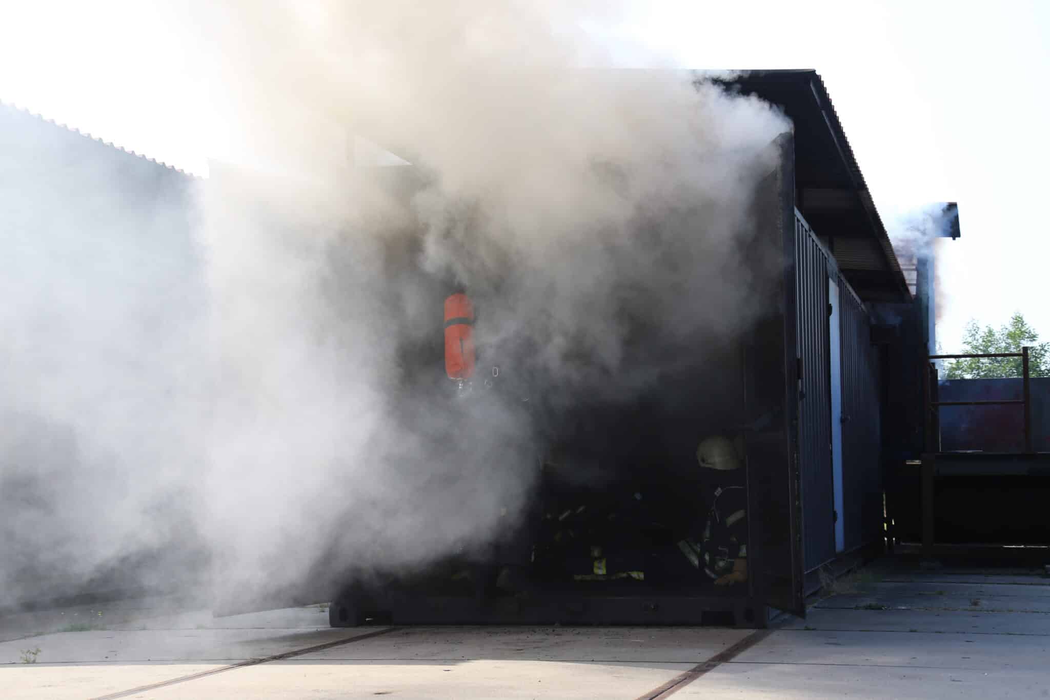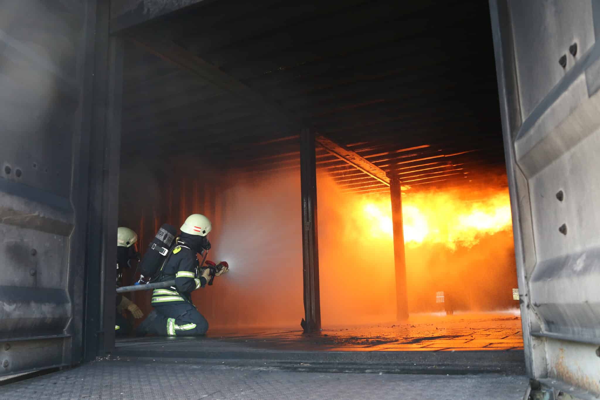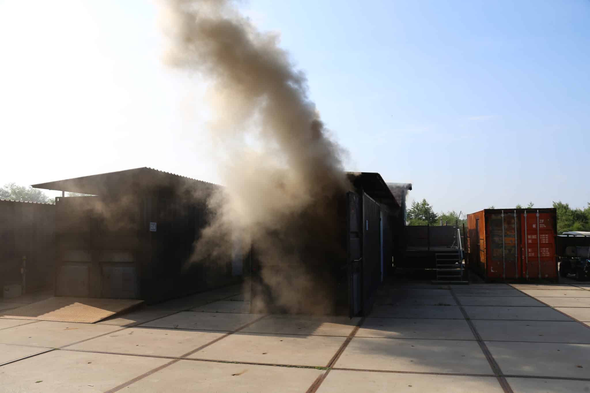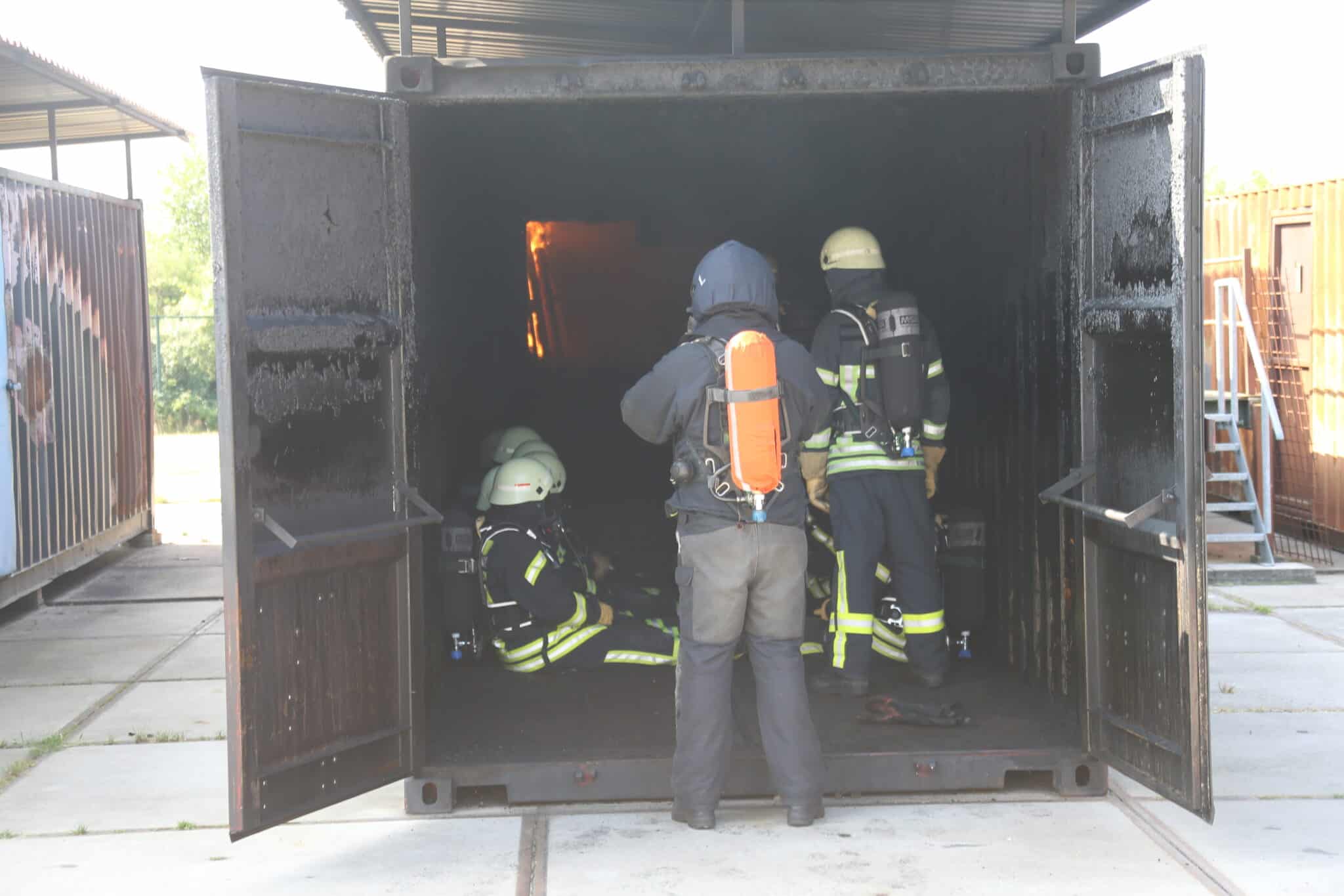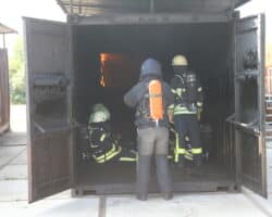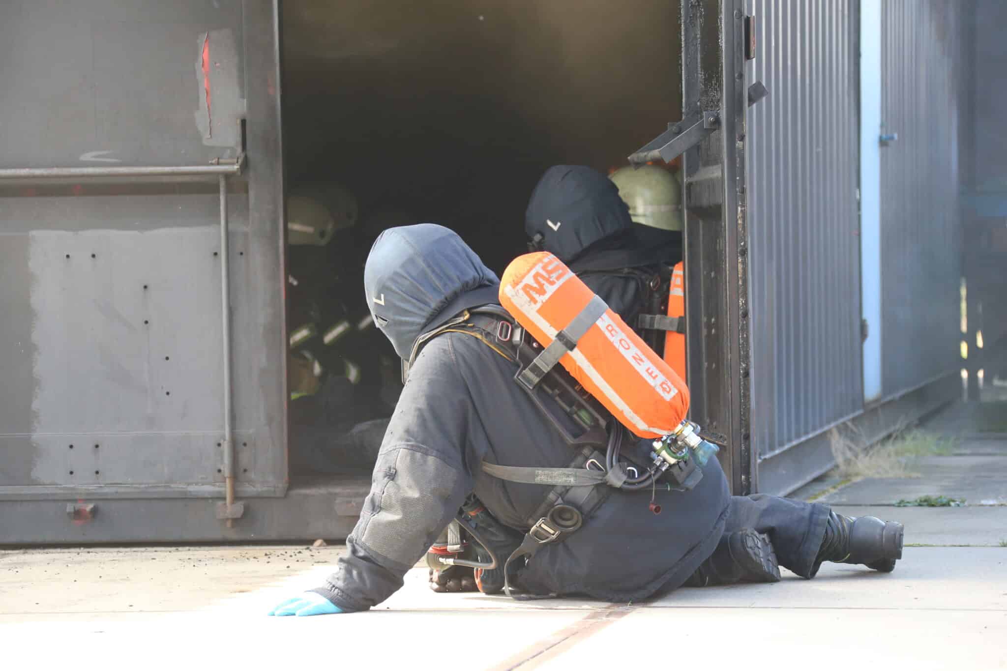 Nach einer kurzen Auffrischung der Strahlrohrtechnik ging es weiter zum Nozzle-Container, der mit Hilfe von Gas betrieben wird. Hier konnten die Strahlrohrtechniken beliebig angewendet werden, um ein Gefühl für das richtige Vorgehen im Einsatz zu erlangen.