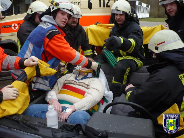 Wenn der Notfall eintritt, muss jeder Handgriff sitzen. Dann ist keine Zeit mehr für ein Vorgehen nach dem Motto „ . . . wir könnten ja mal versuchen,. . .“ Die Rettung von Menschen aus einer ganz besonderen Notfallsituation ist dabei auch für die Rettungsdienstmitarbeiter keine alltägliche Situation. Sie erfordert einerseits eine möglichst standadisierte Vorgehensweise, meist aber auch ein beachtliches Maß an Improvisationstalent. Derartige Notfallsituationen können nur in Zusammenarbeit mit Kräften der Gefahrenabwehr bewältigt werden. Vor diesem Hintergrund fanden jetzt auf dem Außengelände des Instituts der Feuerwehr NRW in Münster die „praktischen Notfallsimulationen“ des Rettungsassistentenlehrgangs der DRK-Rettungsschule Münster statt. Unter Leitung von Thorsten Magdalinski (Institut der Feuerwehr NRW) und Christian Eisenberg (Feuerwehr Unna) und unterstützt von Frauen des RUD-Teams (realistische Unfall-Darstellung) und der Wachabteilung I der Feuer- und Rettungswache Gronau wurden mehrere Übungsszenarien durchgespielt. Fall 1: In einer Kfz-Werkstatt ist ein Pkw von einer Hebebühne gerutscht, eine Person wird dabei unter dem Pkw eingeklemmt. Fall 2: Eine Person fällt auf dem Balkon im fünften Obergeschoss eines Wohnhauses vom Gerüst. Fall 3: Aus einer verschlossenen Garage dringen Abgase von einem laufendem Pkw nach draußen – eine Person wird vermisst. Fall 4: Auffahrunfall, zwei Personen sind in einem Pkw schwer verletzt eingeklemmt. Neben dem Ernstfall-Training machten sich die angehenden Rettungsassistenten mit dem hydraulischen Rettungsgerät der Feuerwehr (Rettungsschere und -spreizer) an einem Schrott-Pkw vertraut.Fazit des praxisnahmen Ausbildungstages: Die Zusammenarbeit mit den angehenden Rettungsassistenten und den Gronauer Feuerwehrleuten (alle Rettungsassistenten) hat bei der Absprache über die Maßnahmen und Durchführung an den jeweiligen Einsatzstellen sehr gut funktioniert – im Ernstfall eine gute Voraussetzung für die Kooperation der unterschiedlichen Rettungsdienste.