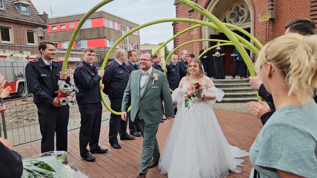 Zur kirchlichen Trauung von Tobias Pohl und seiner Braut fanden sich heute der Löschzug Gronau und die Jugendfeuerwehr vor der evang. Stadtkirche ein.