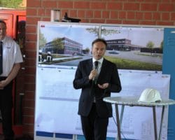 Stellv. Bürgermeister Rainer Doetkotte, Landrat Dr. Kai Zwicker und Leiter der Feuerwehr Gronau Marco van Schelve wiesen in ihren Reden auf Wichtigkeit des Neubaus hin. Der stellv. Bürgermeister nahm die Anwesenden mit auf eine kleine Zeitreise von den Anfängen bis zum heutigen Tag des Spatenstichs.