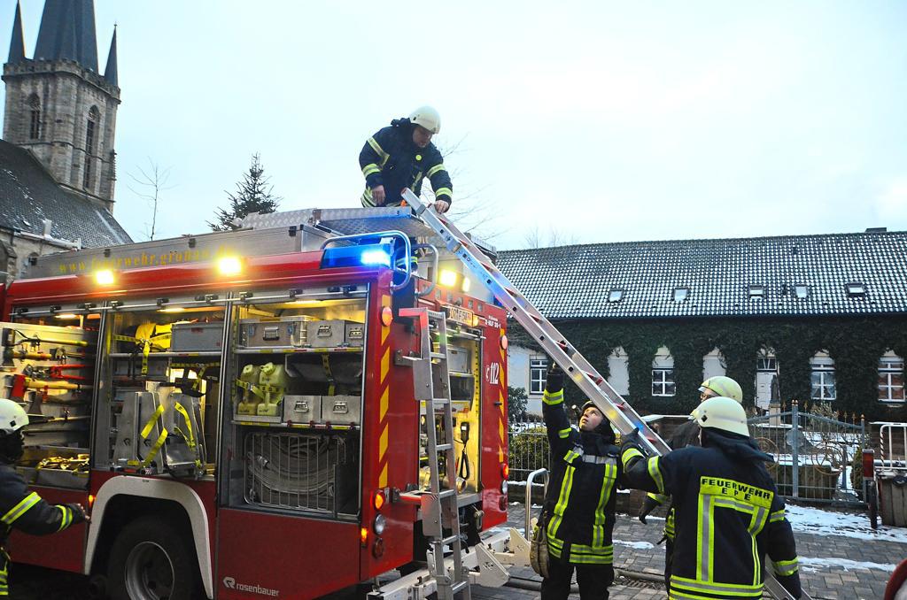 Beide Löschzüge rücken sofort aus. Minuten später treffen die ersten Retter ein. Auf der Rückseite des Gebäudes ruft einer der „Vermissten“ aus dem Fenster im Obergeschoss panisch um Hilfe. Über eine Leiter kommen die Feuerwehrleute zur Hilfe.