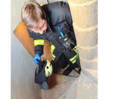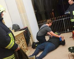 Küster Christian Holtkamp befand sich tatsächlich im Turm – seine Notlage einschließlich Beinbruch und Gehirnerschütterung war glücklicherweise nicht echt. Äußerst echt allerdings war die Anstrengung für die eingesetzten Kräfte. Und die Frage, wie sie den Küster nach unten bringen sollten, war eine harte Nuss. Eine Trage hätte sich in der engen Wendeltreppe verhakt. Schließlich wurde ein Rettungstuch verwendet, in dem – nein, nicht der Küster selbst – eine Puppe, die Stufen hinabgetragen wird. Aus dem Pfarrhaus haben die Retter inzwischen unter Atemschutz die Vermissten gesucht und gefunden.