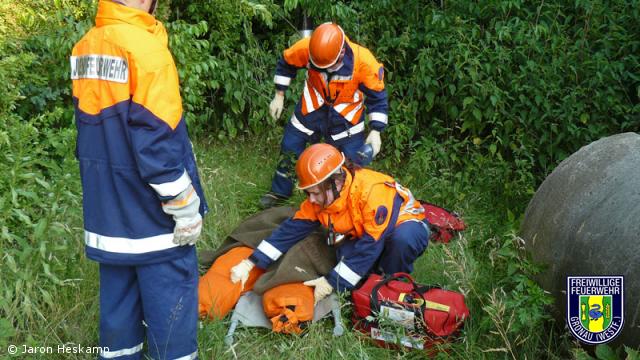 Die Jugendgruppe Epe war am Dienstag, den 18.06.2008 gefordert. Gemeldet wurde: "Unbekannte Lage nach Explosion auf Firmengelände, eine Person vermisst, weitere zwei verletzt. In der Umgebung kam es zu Entstehungsbränden." Nachdem der Gruppenführer den Trupps ihre Aufgabe zugeteilt hatte, ging es auch schon los. Es wurde eine Wassersorgung über ca. 200 Meter gelegt, um den "Brand auf dem Flachdach" zu löschen. Ein Trupp drang unter Atemschutz durch das Kanalsystem, um die vermisste Person zu bergen. Ein weiterer Trupp unterstützte.