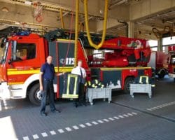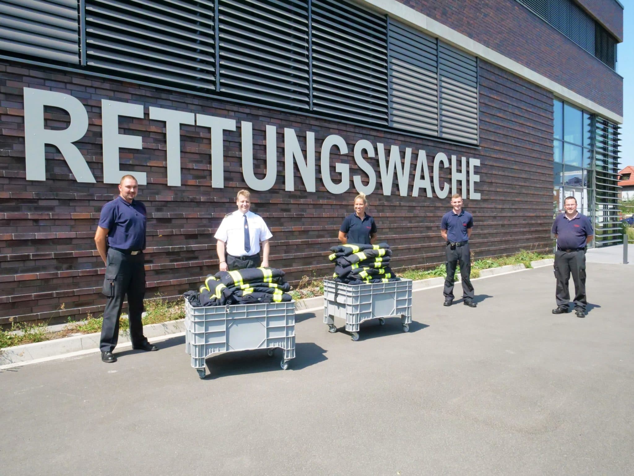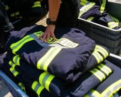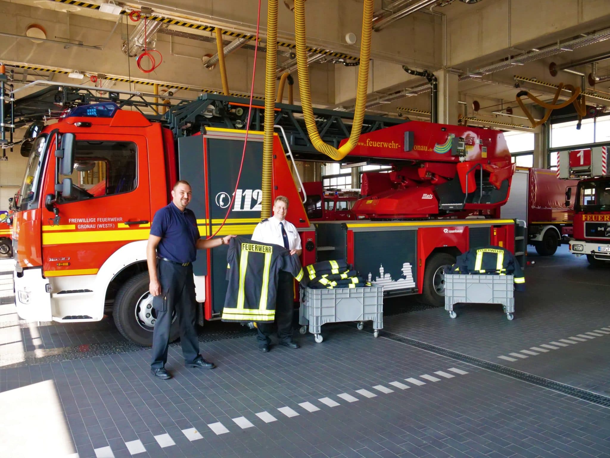 Vor kurzem übergab eine kleine Delegation der Urenco Werkfeuerwehr (Mirko Thebelt und Tobias Benkhoff) der Feuerwehr Gronau eine Kleidungsspende bestehend aus 25 Schutzjacken sowie dazu passenden Schutzhosen. Hintergrund ist das neue Hygienekonzept der Feuerwehr Gronau. Dieses sieht vor, dass von nun an Schutzkleidung, die während eines Löscheinsatzes getragen und durch Brandrauch kontaminiert wurde, noch direkt am Einsatzort gewechselt werden muss. Kontaminierte Schutzkleidung steht in Verdacht das Krebsrisiko zu erhöhen. Da die Feuerwehr Gronau aktuell nicht über genügend Ersatzkleidung verfügt, stellte die Umsetzung des neuen Hygienekonzepts eine gewisse Herausforderung dar. Aufgrund der jahrelangen guten Verbindung zwischen der Feuerwehr Gronau und der Urenco Werkfeuerwehr sowie des Umstandes, dass die Urenco Werkfeuerwehr just mit neuer Schutzkleidung ausgestattet wurde, stand es außer Frage die immer noch einwandfreie, ausrangierte UD Kleidung an die Kollegen aus Gronau weiterzugeben. „Es ist toll, dass wir hier kurzfristig unterstützen können, um eventuellen Spätfolgen durch kontaminierte Kleidung vorzubeugen“, so Tobias Benkhoff während der Übergabe. Wehrführer Marco van Schelve nahm die Schutzkleidung zusammen mit ein paar Kollegen stellvertretend für die Feuerwehr Gronau entgegen: „Dank dieser Unterstützung kann das geplante Hygienekonzept nun endlich umgesetzt werden. Immer mehr Gefahrstoffe befinden sich im Brandrauch und mit der neuen Kleidung wird eine Verschleppung unterbunden – erst schützen wir vor den Gefahren, jetzt können wir uns auch selber besser schützen“.