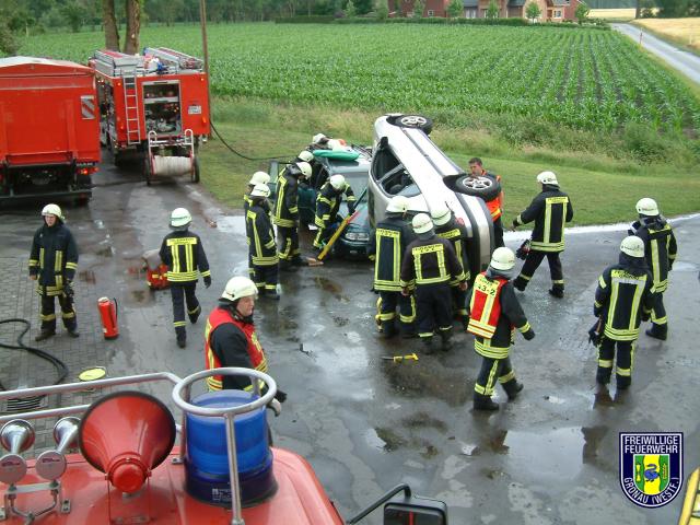 Am Donnerstag, dem 16.06.2011, hatte Günter Kendzierski den Dienstabend mit dem Thema "Technische Hilfe" vorbereitet. Hierzu bediente er sich der Unterstützung des Autohauses Thörner, die zwei Unfallautos zur Verfügung stellten. Die Unfallsituation stellte sich wie folgt dar: Ein Fahrzeug lag seitlich auf der Motorhabe des anderen Fahrzeuges. In beiden Fahrzeugen waren Personen eingeklemmt. Bei der Übung ging es vornehmlich nicht um Schnelligkeit, sondern um die Stabilisierung des Fahrzeuges, die medizinische Versorgung der Patienten sowie die patientengerechte Rettung. Hier kamen die neuen Geräte des HLF, Stabfass, etc. zum Einsatz. Es wurde genau erklärt, wie man mit diesen Geräten umgeht. Ein interessanter Dienstabend, der für alle Beteiligten sehr lehrreich war.