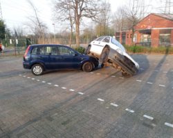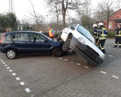 Nach Erkundung der Einsatzstelle durch das ersteintreffende Fahrzeug wurden beide Fahrzeuge stabilisiert. Hierzu wurde der blaue PKW unterbaut, der weiße PKW nach hinten mit einem Greifzug und vorne mit dem Stabfast-System gegen umkippen gesichert. Die Insassen wurden durch die Feuerwehr ständig betreut.