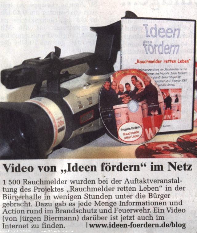 Video von Ideen fördern im Netz Von: Webteam Feuerwehr Gronau 10. Februar 2007 Pressebericht zur Veröffentlichtung der Filme zur Auftaktveranstaltung: Eine Stadt sagt Feuer den Kampf an Filme können aktuell auch nebenstehend angeklickt werden