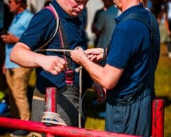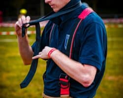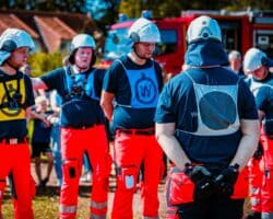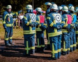 Die Aufgabenstellungen waren beim Leistungsnachweis vielfältig: Einen Löschangriff auf Zeit aufzubauen war dabei eine. Es musste eine Leitung zur Wasserentnahme zu viert gekuppelt werden und dann Leitungen für drei Strahlrohre aufgebaut werden um die fiktiven Feuer zu löschen. Auch erste Hilfe mussten die Gruppen leisten: Eine Reanimation einer Übungspuppe musste ebenso wie ein Druckverband und eine stabile Seitenlage fehlerfrei vorgeführt werden. Nach der Übung „Knoten und Stiche“, bei der drei verschiedene vorgegebene Knoten gezeigt werden mussten, darunter in diesem Jahr der Krawattenknoten, mussten auch Fragen zu Feuerwehr- wie Allgemeinwissen beantwortet werden.