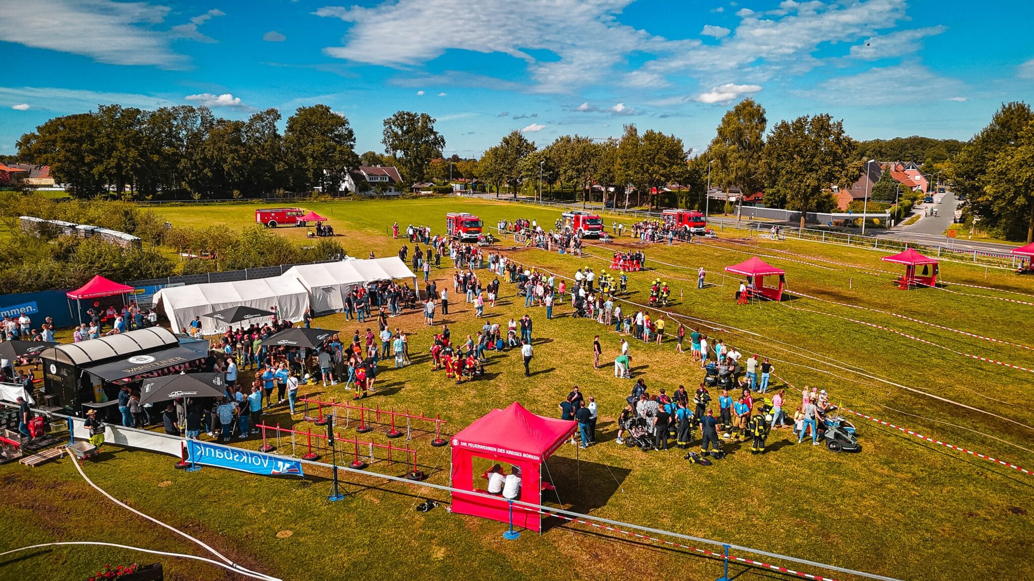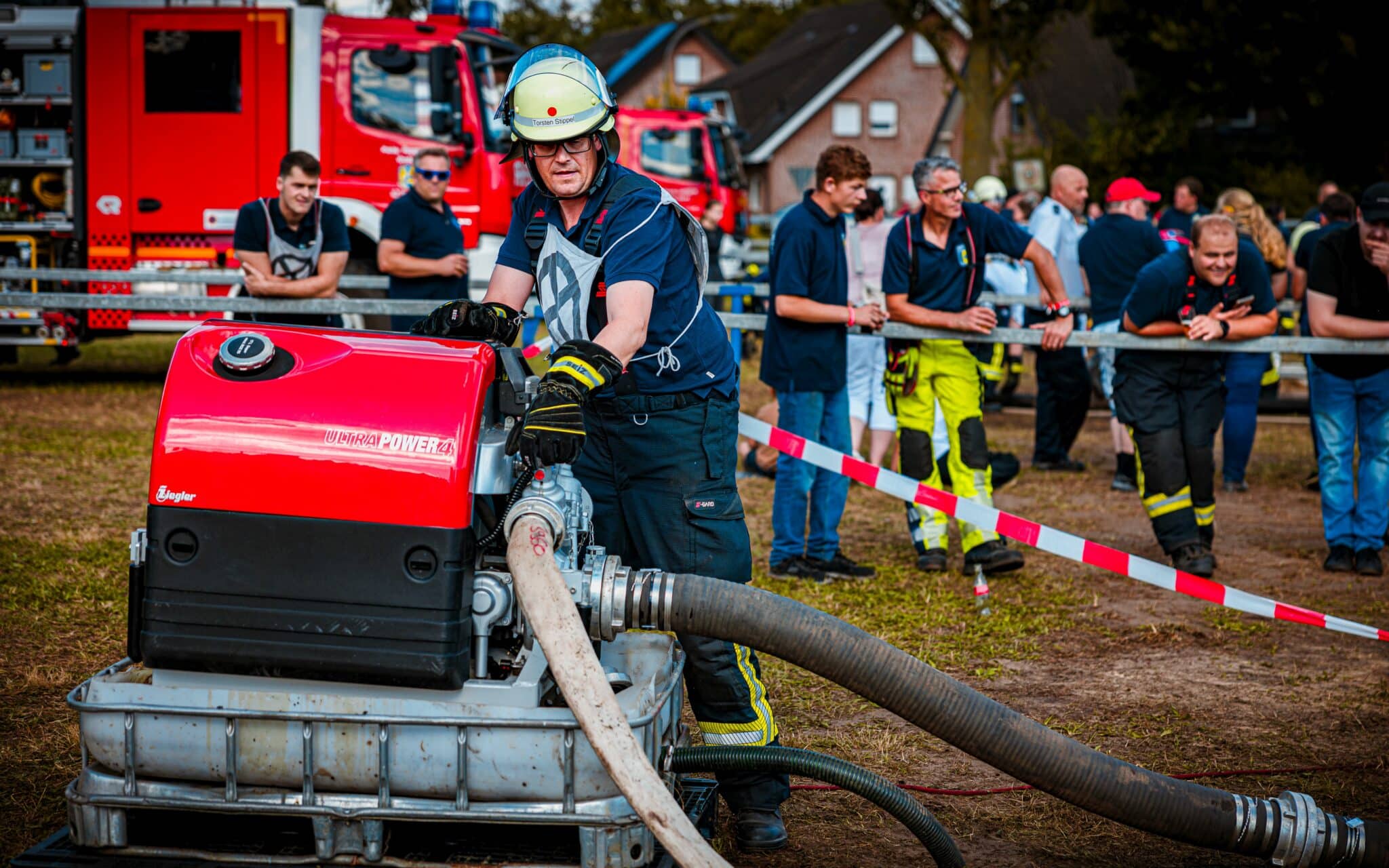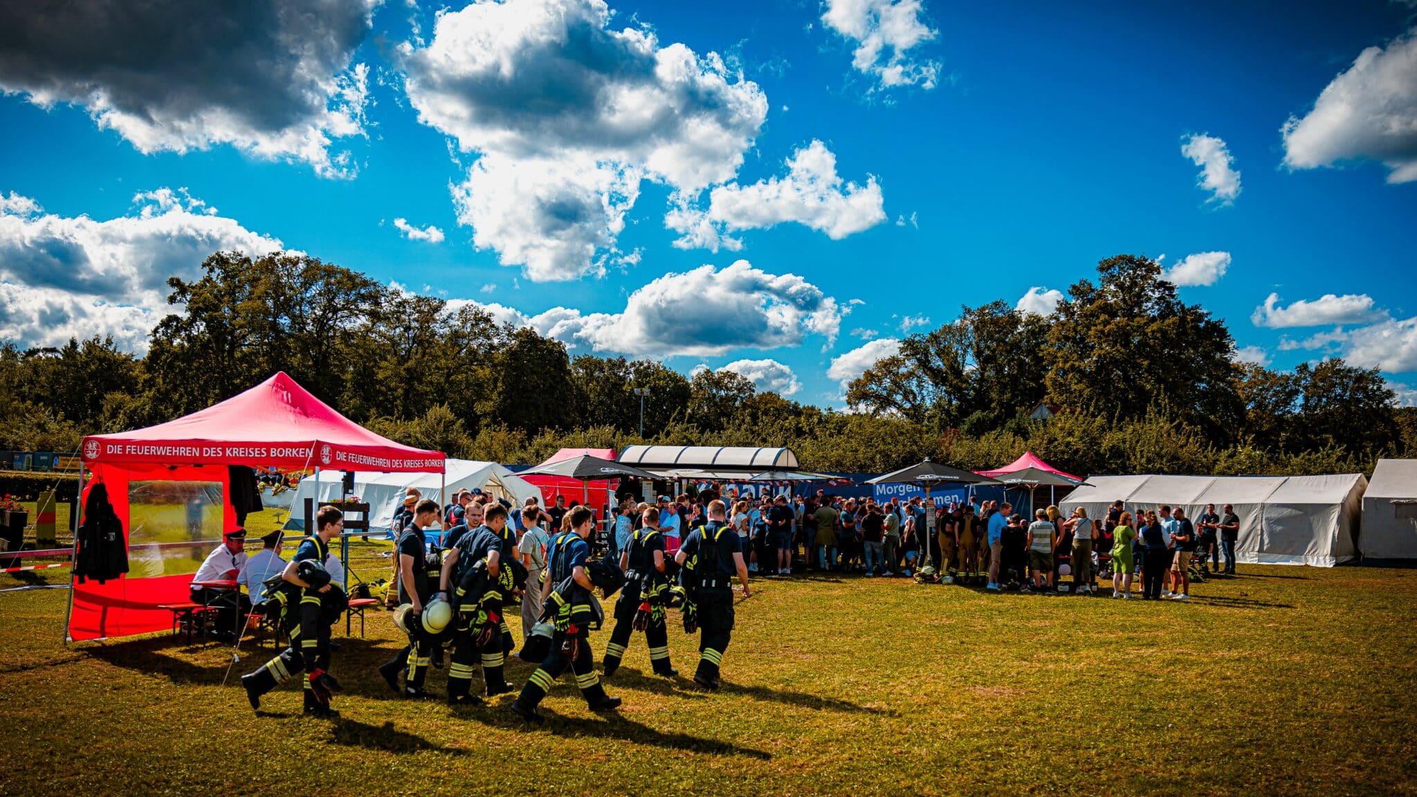 Bestes Wetter und ausgelassene Volksfeststimmung herrschte am vergangenen Sonntag in Gronau-Epe beim Leistungsnachweis der Feuerwehren des Kreis Borken. Insgesamt rund 5000 Besucher und Besucherinnen sowie Feuerwehrangehörige waren auf das Gelände des Reit-, Zucht und Fahrvereins Epe e.V. gekommen. Bei strahlendem Sonnenschein und angenehmer Wärme zeigten die 72 Gruppen der verschiedenen Feuerwehren aus dem Kreis Borken, aus Leverkusen und Bottrop ihr Können. Gemischte Gruppen aus Feuerwehr und THW sowie aus deutschen und niederländischen Kameraden sind schon seit Jahren Teil des Leistungsnachweises. „Fachfremd“ trat in diesem Jahr sogar eine Gruppe des DRK Ortsverband Nienborg-Heek an und zeigte eindrucksvoll, dass auch sie die Aufgaben lösen konnten. Mit einer fehlerfreien Leistung und einer Zeit im vorderen Drittel ließen die Kameradinnen und Kameraden auch so manche Feuerwehr-Gruppe hinter sich.
