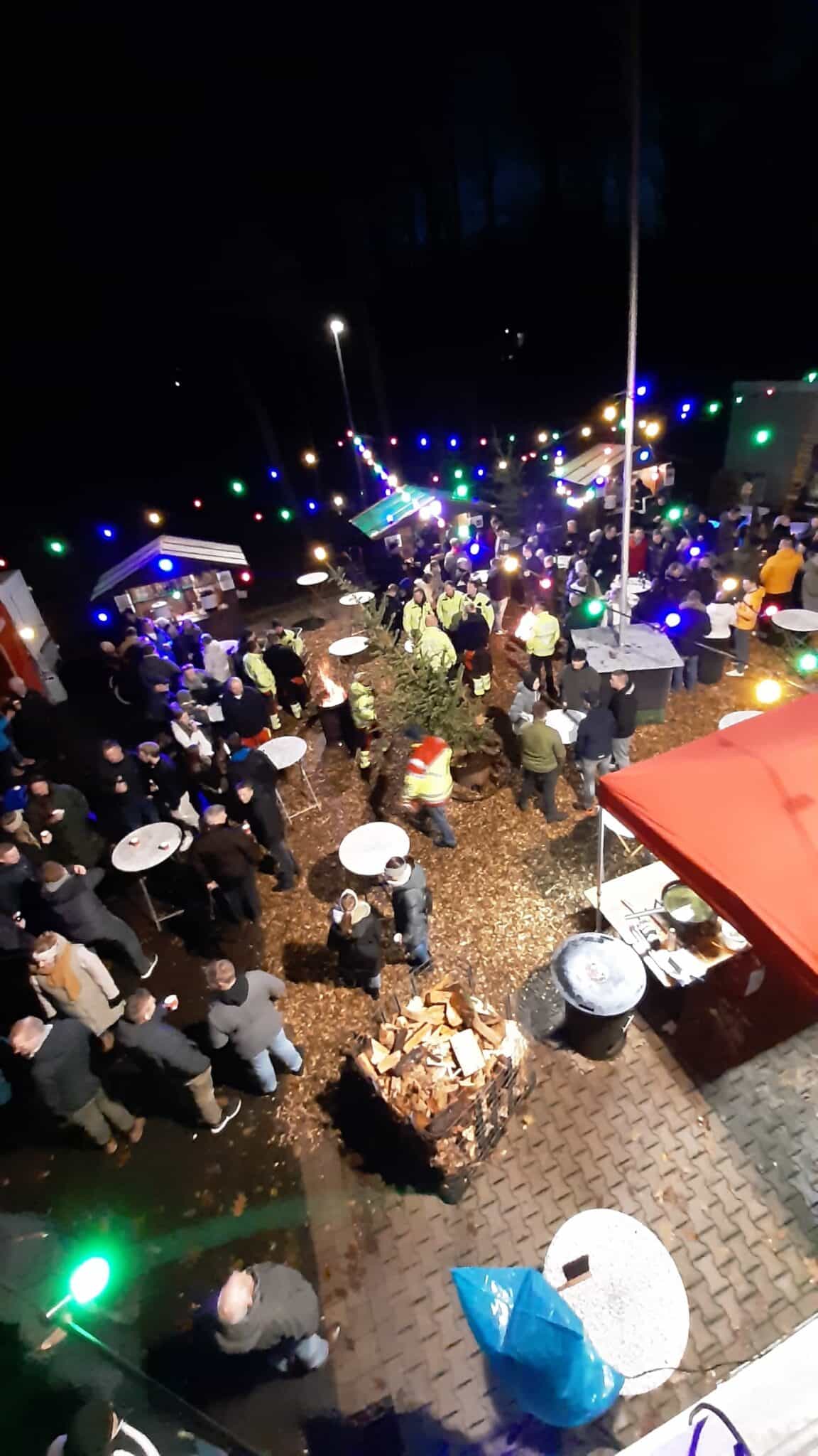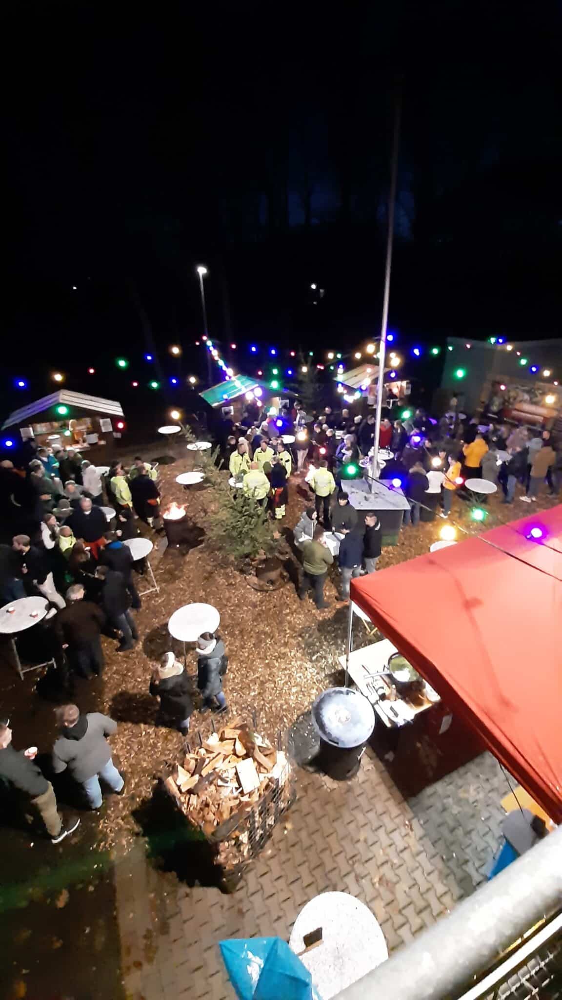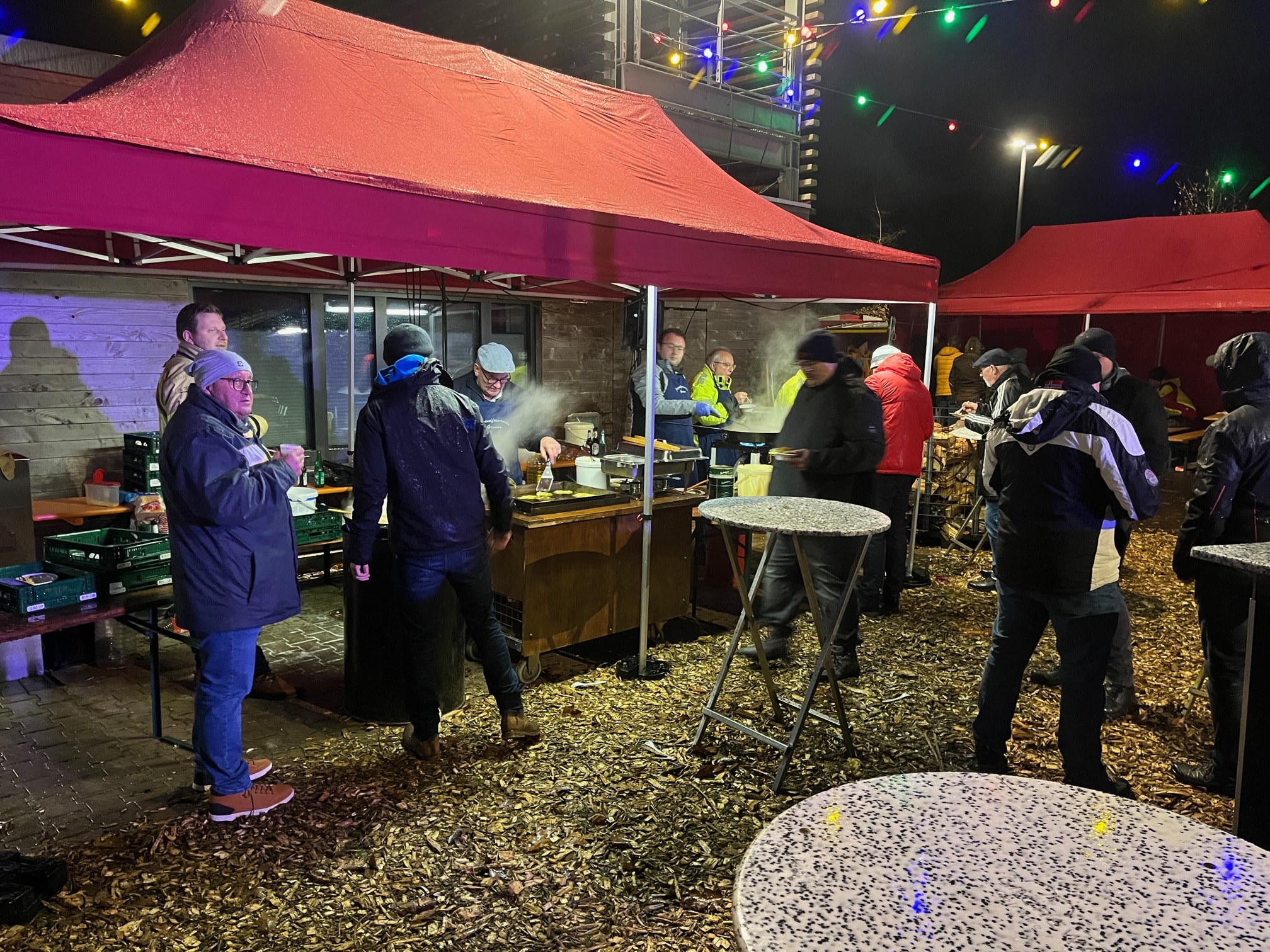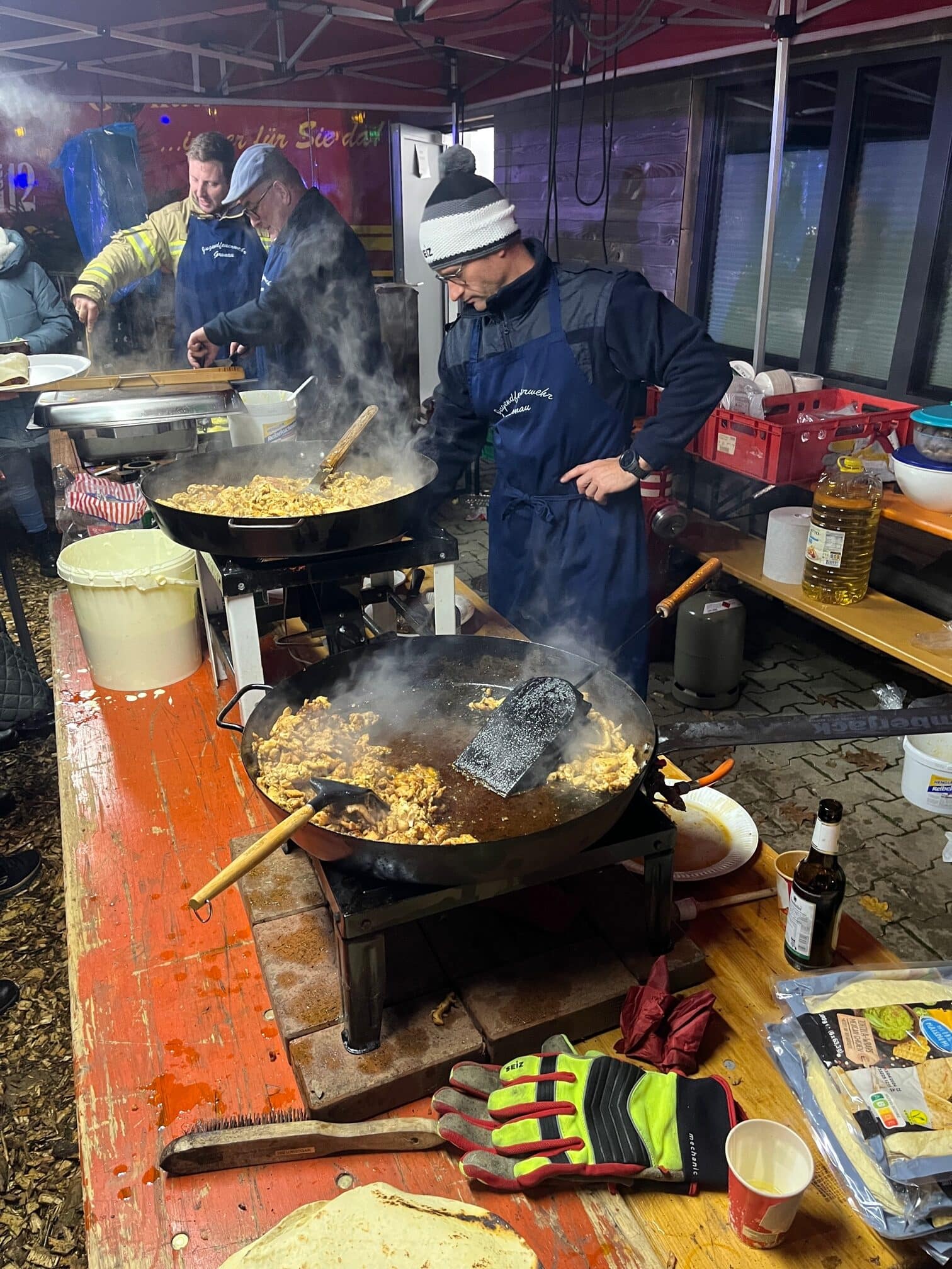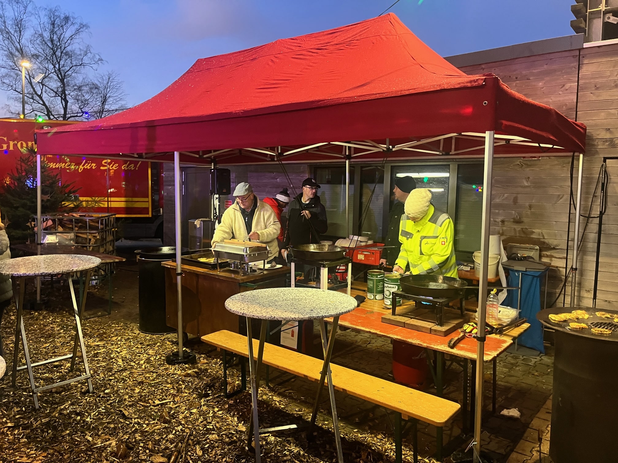 Die Übungsfläche wurde für den Weihnachtsmarkt speziell hergerichtet. Aus 3 Holzhütten wurden Getränke ausgeschänkt. Verpflegt wurden alle Gäste mit frisch zubereiteten Kartoffelpuffer, Geschnetzeltem und Champignons.