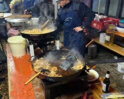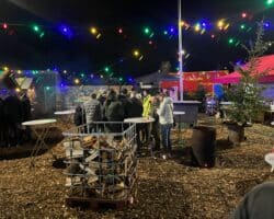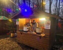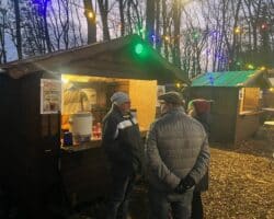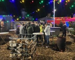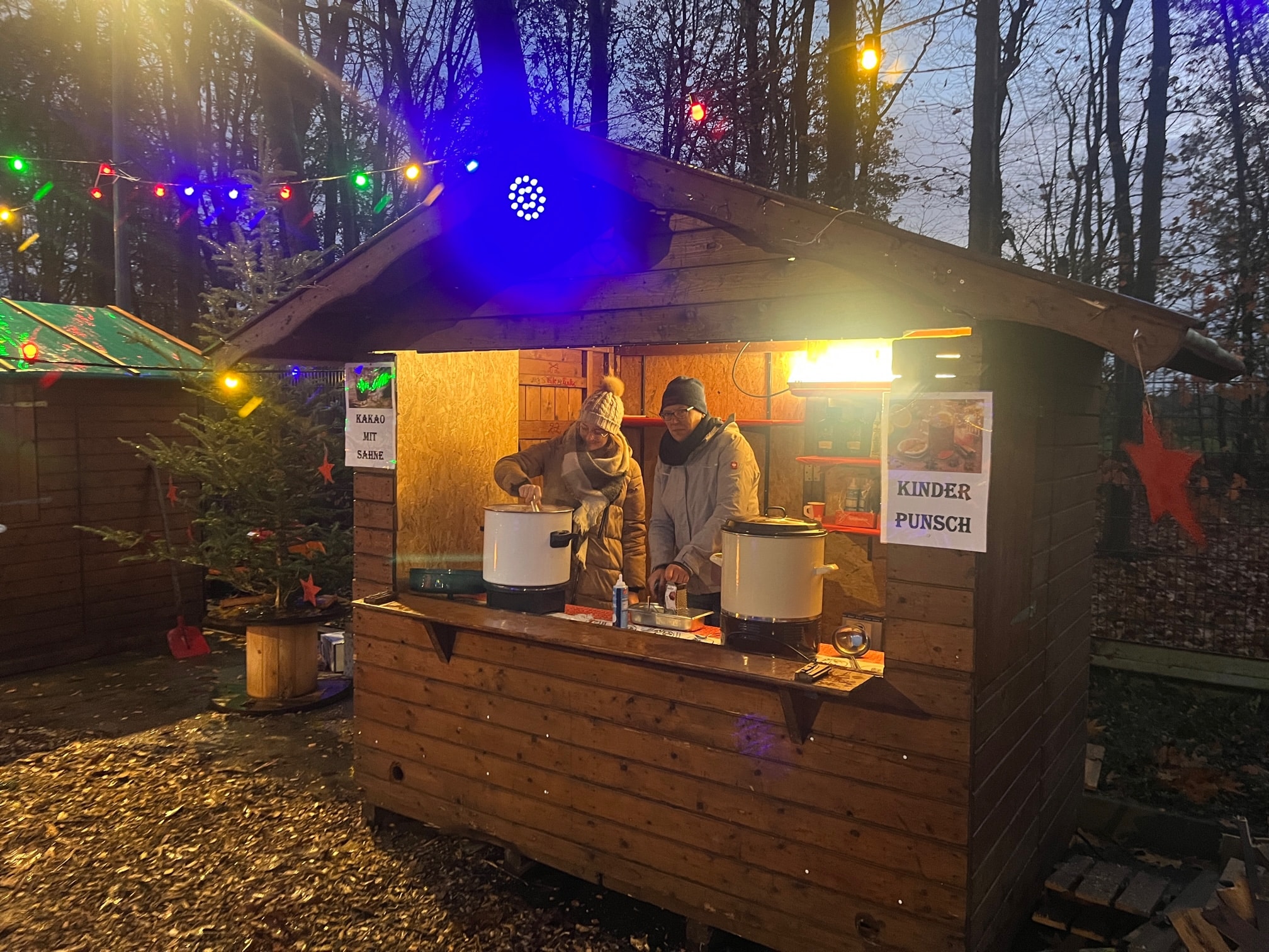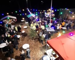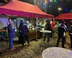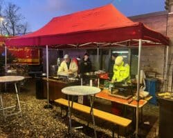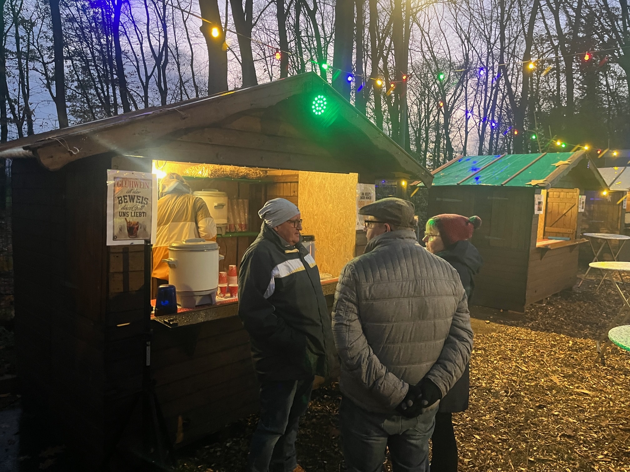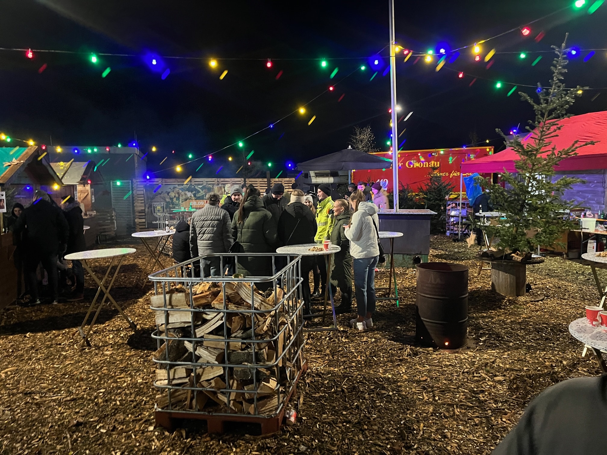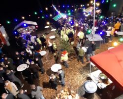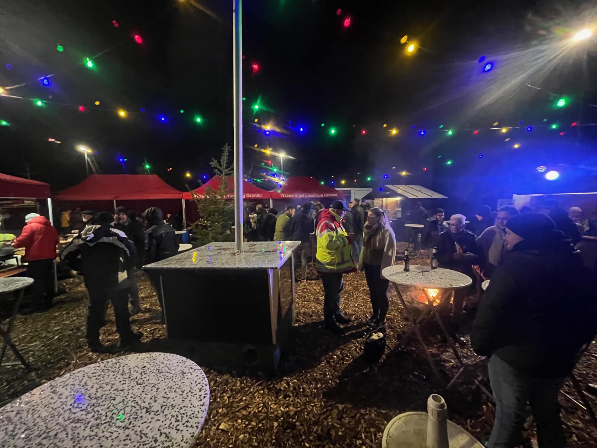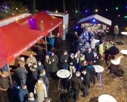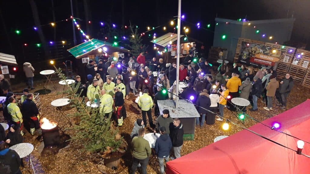 Die Übungsfläche wurde für den Weihnachtsmarkt speziell hergerichtet. Aus 3 Holzhütten wurden Getränke ausgeschänkt. Verpflegt wurden alle Gäste mit frisch zubereiteten Kartoffelpuffer, Geschnetzeltem und Champignons.