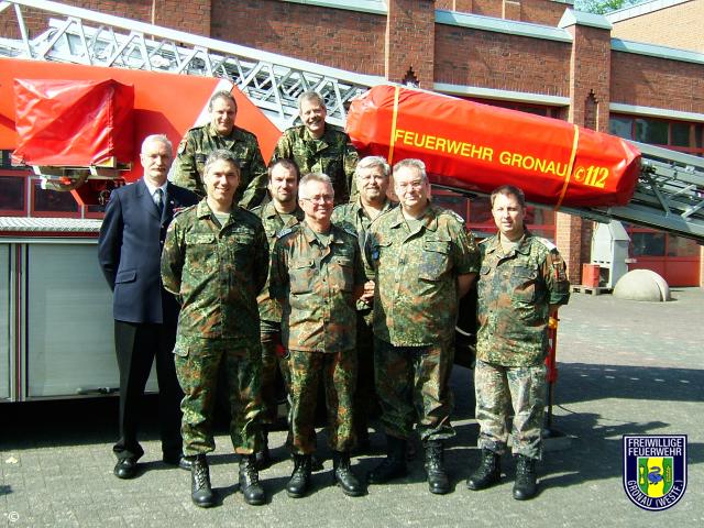 So führte der erste Besuch zum Kennenlernen des Kreisgebietes die Bundeswehroffiziere des KVK in den Norden des Kreises, zur Feuerwehr Gronau. Der verantwortliche Sanitäts-Stabsoffizier Oberfeldarzt Prof.Heiner Woltering hatte diese Einladung ermöglicht, da er der freiwilligen Feuerwehr Gronau als Feuerwehrarzt angehört und hier zivil-militärische Zusammenarbeit schon seit langer Zeit praktisch bekannt ist.