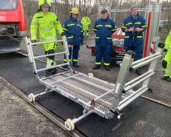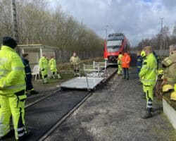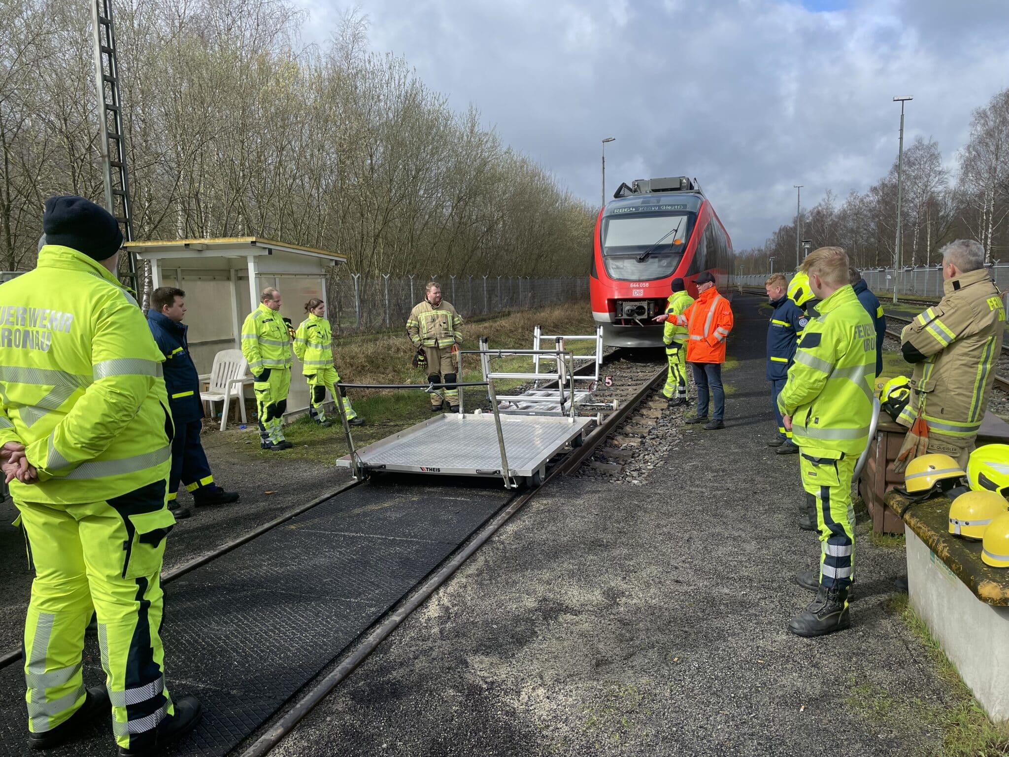 Das zweite Seminar fand im Abstellbereich hinter dem Gronauer Bahnhof statt. Mit Notfallmanager, Bezirksleiter und Fahrpersonal der Deutschen Bahn wurden von den Kameradinnen und Kameraden wichtige Informationen zu Bahnunfällen ausgetauscht. Notfallmanager Dominik Weigel, selbst Mitglied der Feuerwehr Ahaus, erklärte den Teilnehmern die Möglichkeiten der Arbeit im Gleisbereich. So stellte das THW Gronau ein Teil des Einsatzgerüstsystems in Verbindung mit speziellen Bahn-Rollen eine Plattform vor, die den Transport auch von schwerem Material und Personen auf der Schiene ermöglicht. Die Feuerwehr Gronau hat ebenfalls Umfangreiches Material für Schieneneinsätze, wie eine leichte Plattform auf Basis der Rettungsplattform des Rüstwagens oder den Rüstsatz Bahn zum Transport von Material und Personen auf der Schiene.